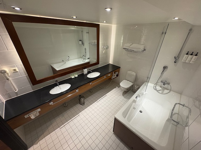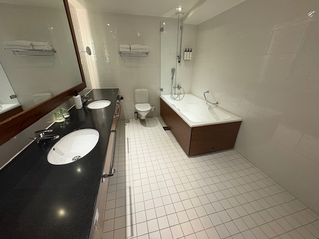 Ist dann doch nicht so ganz der gebuchte Standard, sondern ein paar Quadratmeter mehr. Eine Junior Suite die laut Homepage zwischen 32-43 qm liegt. Diese kommt mit einer großzügigen Einrichtung daher, die man eigentlich als Einzelreisender gar nicht braucht. Eine Couch für 4 Personen und viel Bewegungsfreiheit sind immer gern genommen. Das Badezimmer ist noch ein wenig old-school, eine klassische Badewanne und 2 Waschbecken sind definitiv in die Jahre gekommen, aber sauber. In Summe ist das upgrade eine schöne Überraschung und lässt den Gast zufrieden einschlafen.