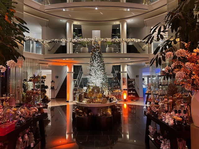 Das Hotel findet man auch an dunklen Wintertagen realtiv schnell. Ein vorgelagerter übergroßer Parkplatz, für welchen auch noch 10 Euro pro Nacht an Parkgebühren genommen werden, vor dem Hotel bietet ausreichend Platz für die Gäste. Der Eingangsbereich ist zur festlichen Jahreszeit ausgiebig mit bunten Lichterketten und viel an Dekoration geschmückt. Irgendwo dazwischen findet man die Rezeption, auf der linken Seite des Eingangsbereiches. Rechts davon befindet sich eine Bar und das Restaurant, wo übrigens auch das Frühstück morgens eingenommen wird. 2 sich gegenüberliegende Fahrstühle bringen die Gäste in das vierstöckige Gebäude, beide sind gläsern und man hat einen schönen Blick in die Lobby hinab. Der im Untergeschoss liegene Spa bietet von 09:00 – 23:00 Uhr neben einem Outdoor- & Indoorpool, einige Sauna- und Dampfbäder sowie die bekannten Ruhezonen. Zur Besonderheit gehört das die Anlage über eine eigene Thermalquelle verfügt, deren Salze und Mineralien beruhigend auf den Körper wirken sollen. Diese Wasserzone bietet sich natürlich für eine gute Entspannung nach einem Fitness-Center-Besuch an. Hell und geräumig ist dieser gestaltet und der angeschlossene Spinningraum lädt auch zur kalten Jahreszeit auf eine Runde intensiven Radfahrens ein.