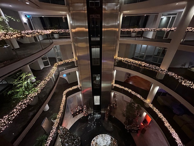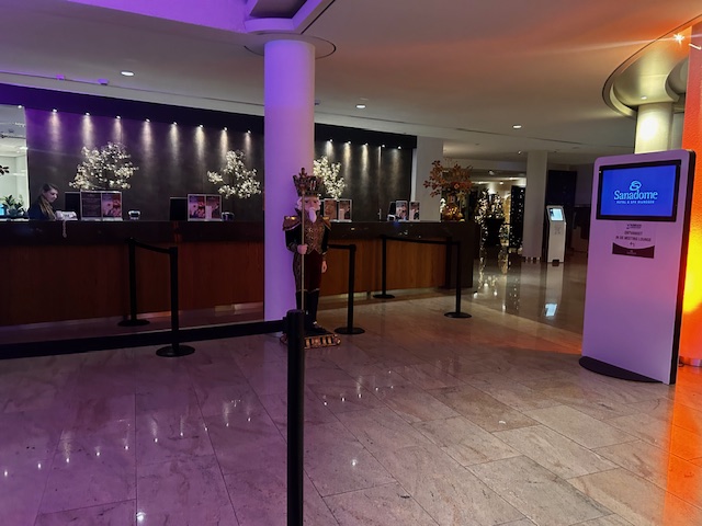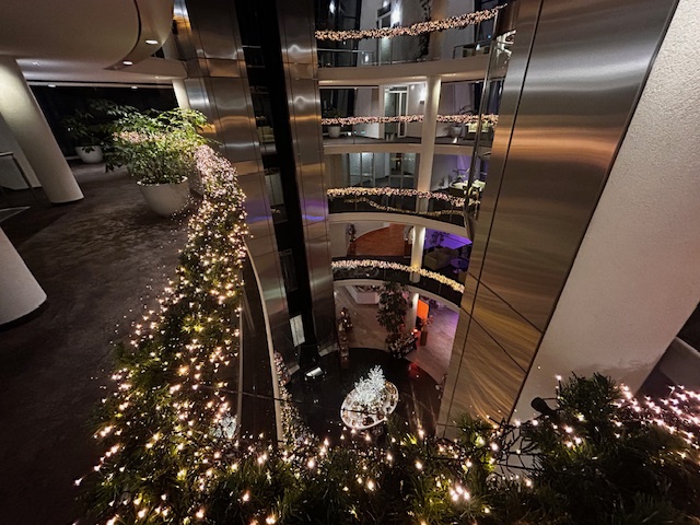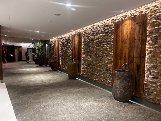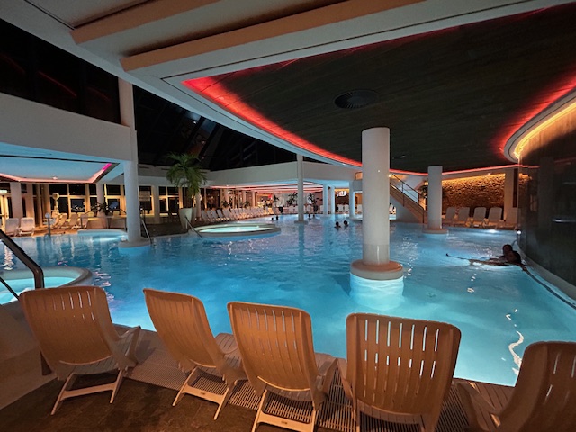 Das Hotel findet man auch an dunklen Wintertagen realtiv schnell. Ein vorgelagerter übergroßer Parkplatz, für welchen auch noch 10 Euro pro Nacht an Parkgebühren genommen werden, vor dem Hotel bietet ausreichend Platz für die Gäste. Der Eingangsbereich ist zur festlichen Jahreszeit ausgiebig mit bunten Lichterketten und viel an Dekoration geschmückt. Irgendwo dazwischen findet man die Rezeption, auf der linken Seite des Eingangsbereiches. Rechts davon befindet sich eine Bar und das Restaurant, wo übrigens auch das Frühstück morgens eingenommen wird. 2 sich gegenüberliegende Fahrstühle bringen die Gäste in das vierstöckige Gebäude, beide sind gläsern und man hat einen schönen Blick in die Lobby hinab. Der im Untergeschoss liegene Spa bietet von 09:00 – 23:00 Uhr neben einem Outdoor- & Indoorpool, einige Sauna- und Dampfbäder sowie die bekannten Ruhezonen. Zur Besonderheit gehört das die Anlage über eine eigene Thermalquelle verfügt, deren Salze und Mineralien beruhigend auf den Körper wirken sollen. Diese Wasserzone bietet sich natürlich für eine gute Entspannung nach einem Fitness-Center-Besuch an. Hell und geräumig ist dieser gestaltet und der angeschlossene Spinningraum lädt auch zur kalten Jahreszeit auf eine Runde intensiven Radfahrens ein.