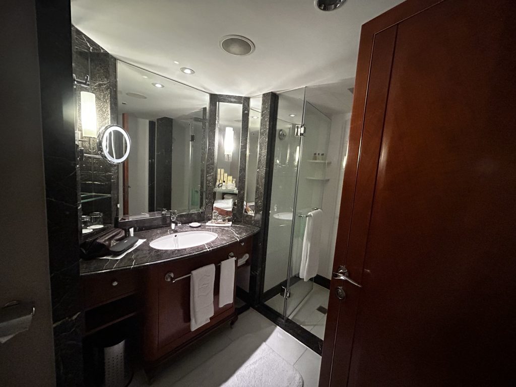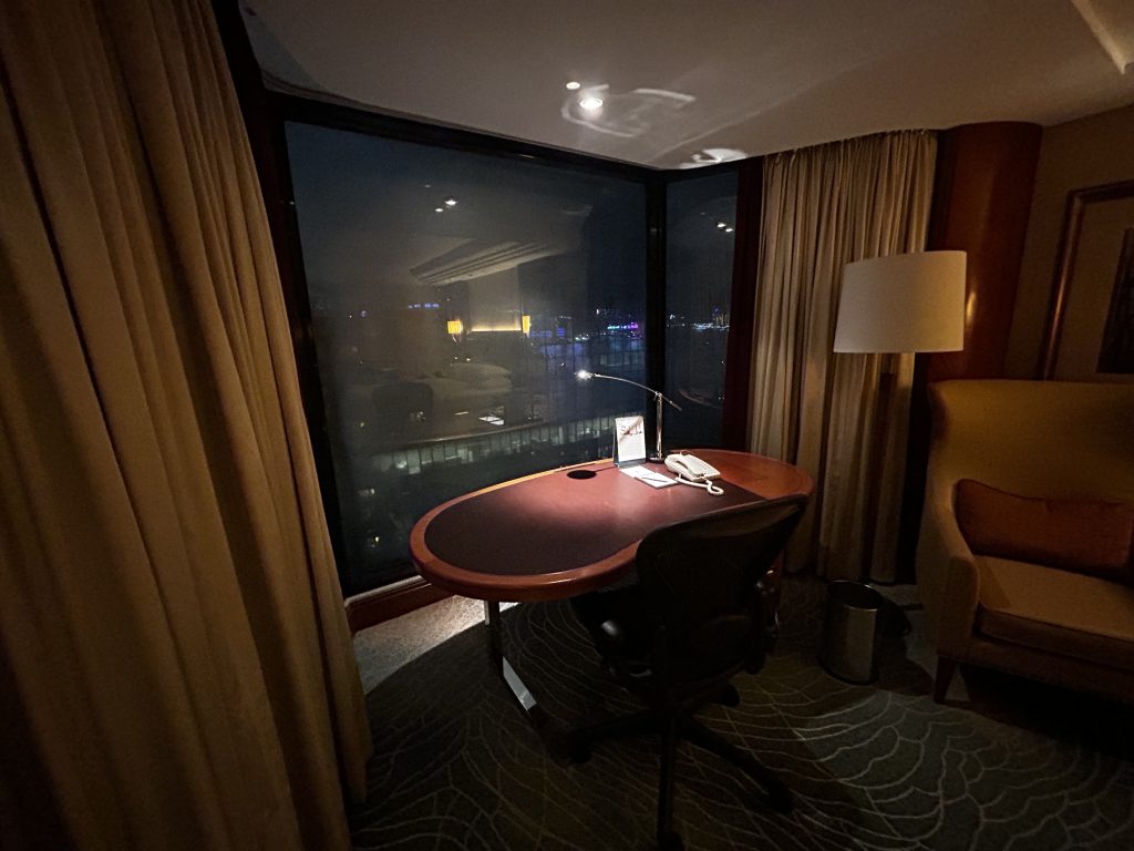 Auch hier dominiert der Teppichboden. Die Aussicht ist sehr gut, leider laufen zu oft die Fenster an, da die Temperaturunterschiede doch groß sind. Hongkong hat super feuchtes, schwüles Wetter um die 32 Grad. Die Räumlichkeit bietet alle Annehmlichkeiten des 21.Jahrhunderts, von USB Anschlüssen, einem Schreibtisch, Tresor, Kleiderschränke bis zum dem Bad mit seiner Rain-Shower-Dusche. Die Minibar Preise sind astronomisch, die Evian Mineralwasser Flasche kostet 12 Euro.