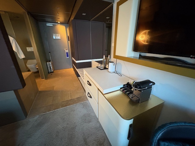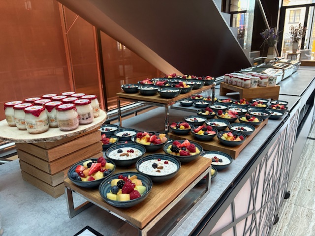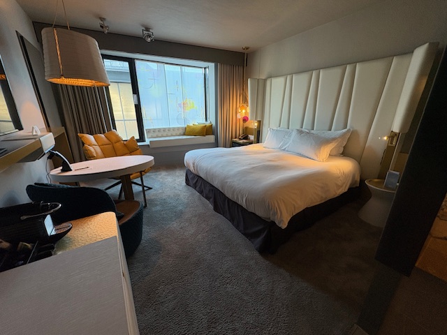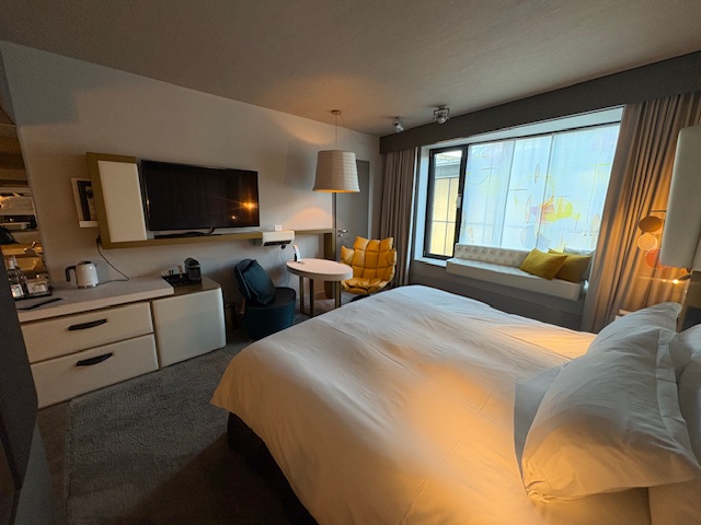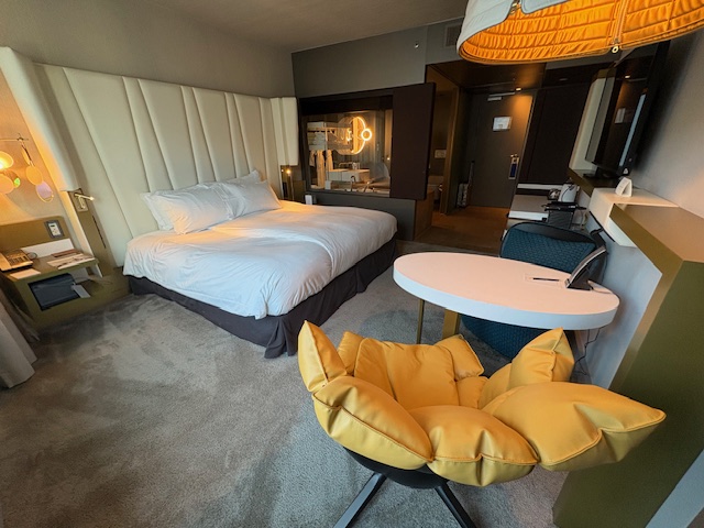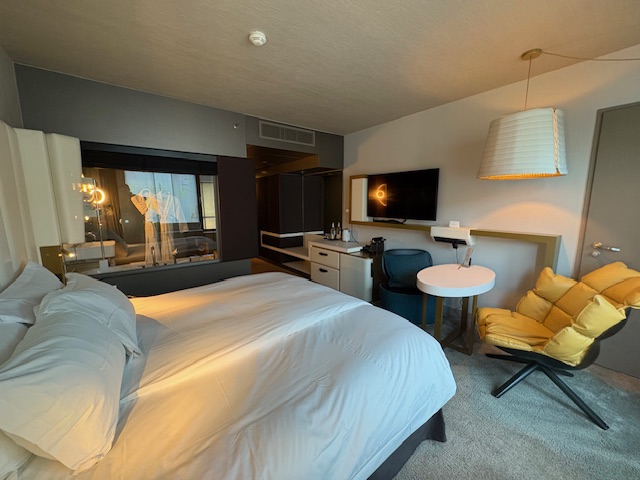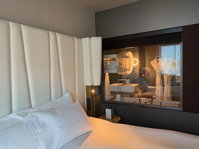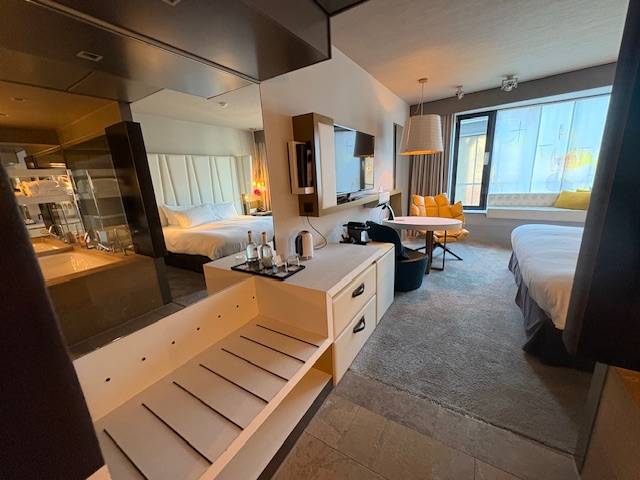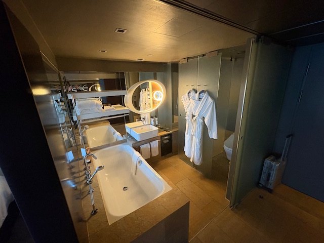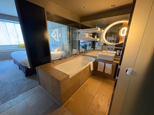 Die Zimmer welches bezogen wird, ein Luxury, mit dem Charme der 20er Jahre, ist 27 QM gross, verfügt über ein transparentes Bad, was sicherlich auch Geschmackssache ist. Die Bettmaterialien sind hochwertig, was man von der Matratze die ein wenig durchgelegen ist, nicht unbedingt behaupten kann. Neben der Regendusche gibt es eine Badwanne, hochwertige Pflegeprodukte von der französischen Marke Diptyque, die auch bei Qatar Airways in der First- und Business Class im Amenity Kid „serviert“ werden. Auch spannend im japanischen Stil, die beheitzte Klobrille, die man dann doch sehr selten in deutschen Hotels findet. Die gut gefüllte Minibar für den schnellen Durst hält die eine oder andere Erfrischung parat, die unmittelbare Nähe zum Hauptbahnhof stört vom Lärmpegel her überhaupt nicht.