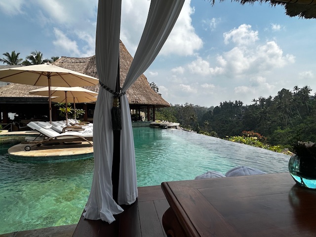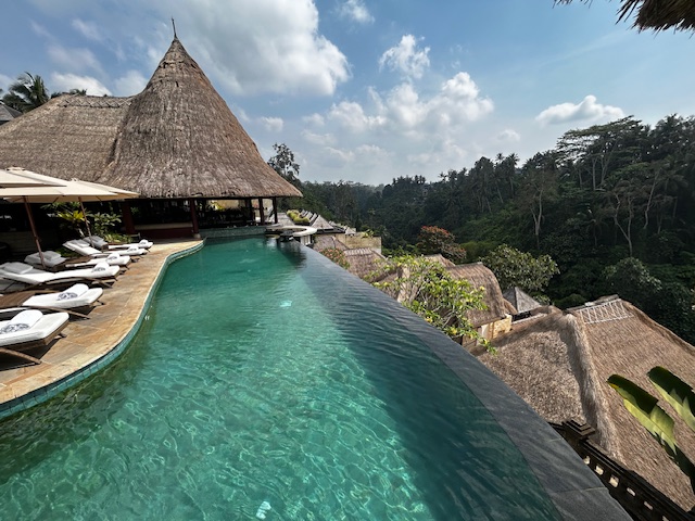 Wer in oder auf Bali ein wenig zurückgezogen seine Zeit verbringen will, der fährt in das Landesinnere. Zum Beispiel nach Ubud, wo man das Viceroy findet, eine Herberge aus dem Luxus-Segment. Bei uns fällt für 4 Nächte die Wahl auf eine Deluxe Villa, mit einem kleinen Pool der im Stil eines Infinity angelegt ist. Anders als diese am Strand, scheint man in ein Meer von Kokos-Palmen hinauszuschwimmen, ein Traum.