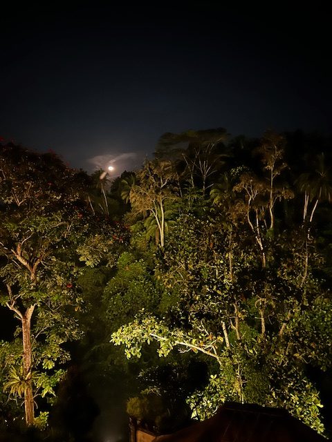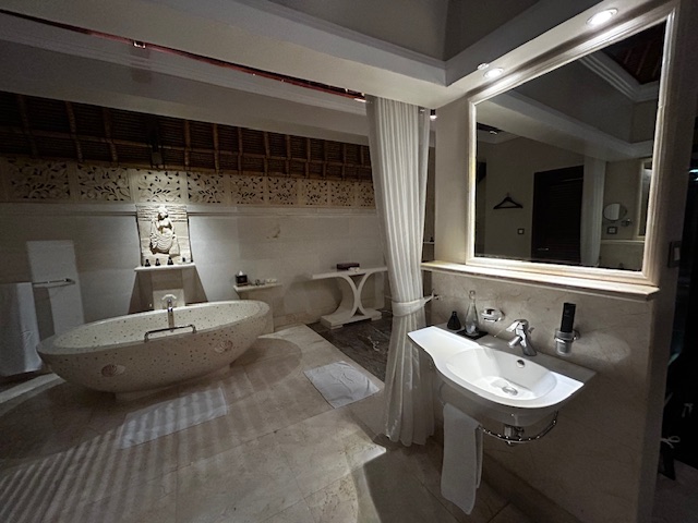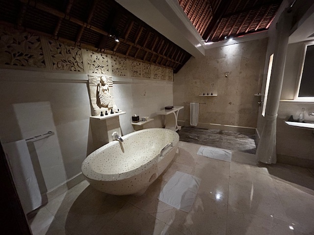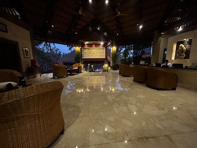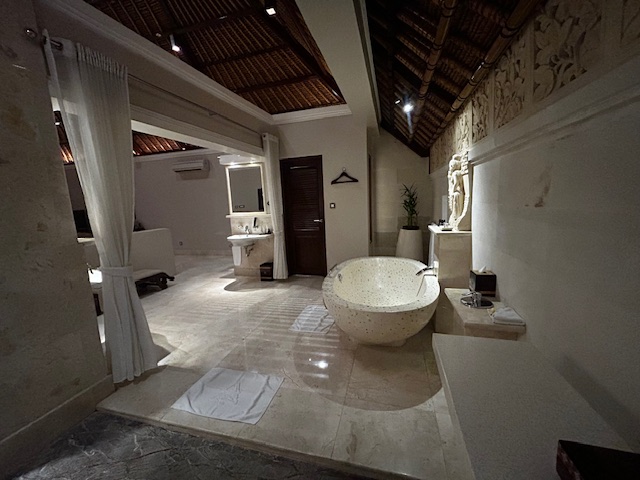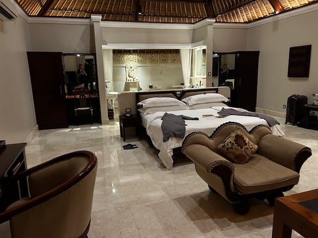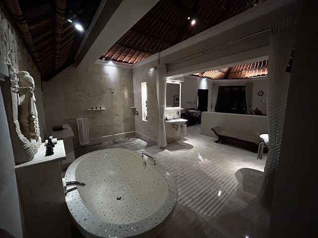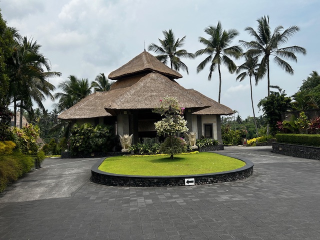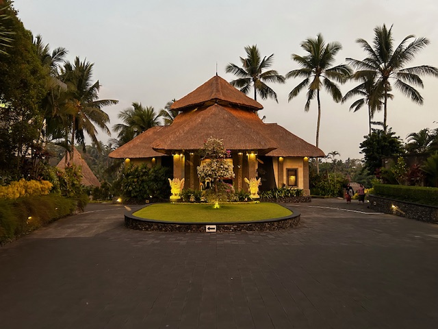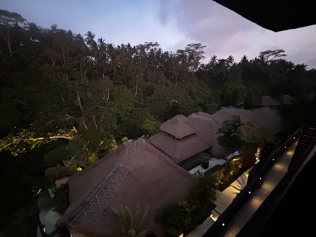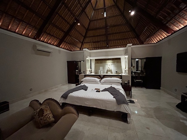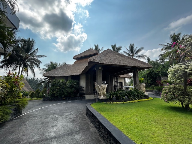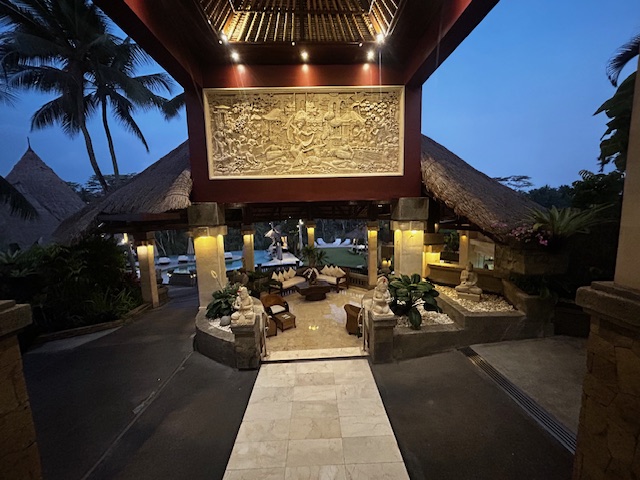 Die Ankunft erfolgt spät, gegen 21:00 Uhr. Nach einer wirren Fahrt vom Flughafen hier hoch, ist man froh wenn man schließlich ankommt. Autofahren auf Bali und in Indonesien ist nichts für schwache Nerven. Man wird in der Regel von links, von rechts und auf einen zufahrend Motorrad überholt. Erschwerend hinzu kommt noch, dass die Straßen eng sind, oft eher einspurig, schlecht beleuchtet, keine seitliche Befestigung haben und man zusätzlich links fährt. Nagut! Der Empfang ist freundlich, im elektrischen Golfcar wird man zur Villa gefahren und für einen späten Snack gibt es ja den 24 Stunden Roomservice.