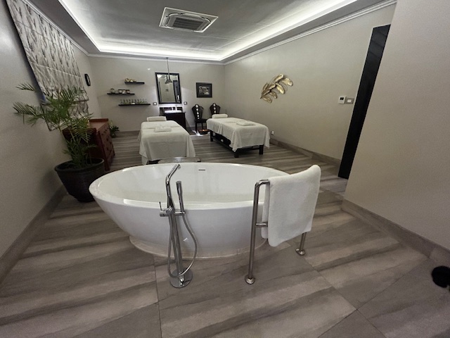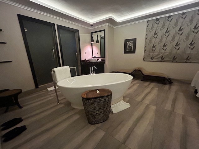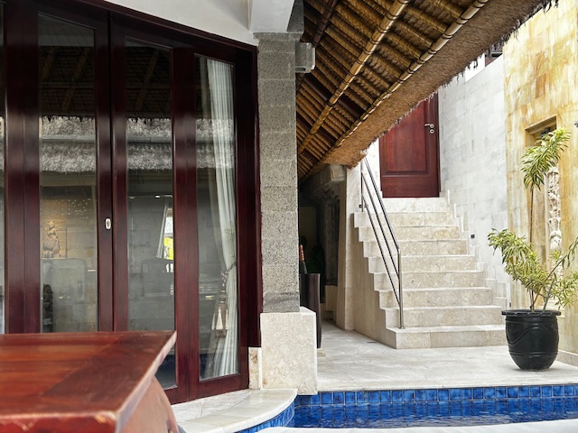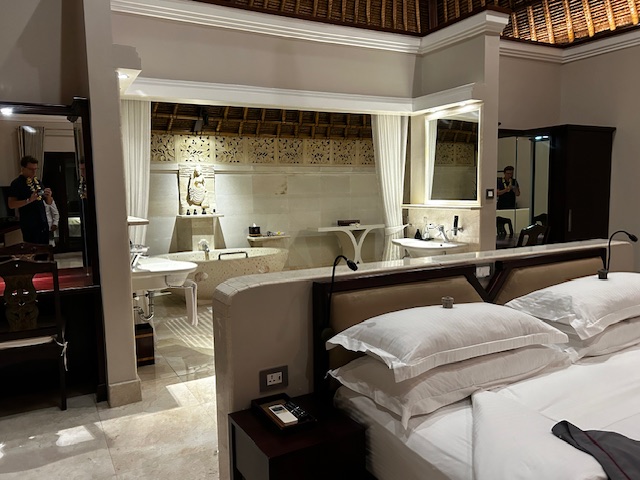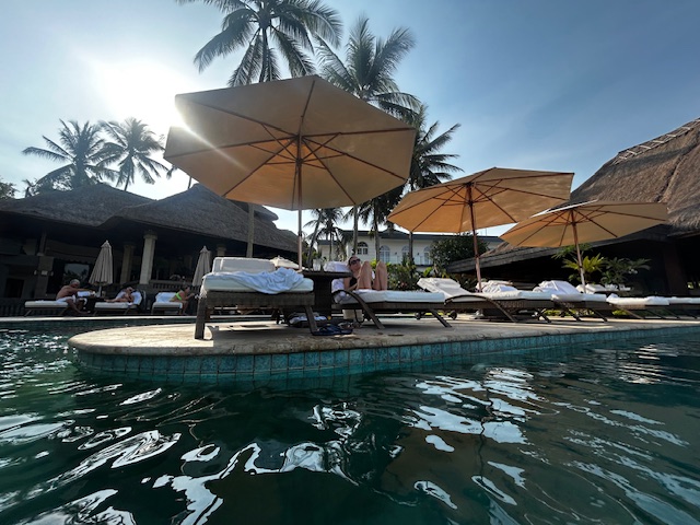 Ein Traum! Das fast schon übergroße Bett, eine Dusche die als solche garnicht zu erkennen ist, weil Sie sich nur dadurch auszeichent das eine Brause an der Wand hängt. Eine Badewanne so königlich groß, die Terrasse mit eigenem Pool, darüber ein Cabana platziert, es ist so das man sich direkt wohlfühlt. Die Klimaanlage ist neben Ventilatoren eine Option etwas Abkühlung zu bekommen oder man nimmt sich ein kühles Bier aus der Minibar. In Summe ist „das Zimmer“ perfekt, inklusiv hoher Decke und Strohdach, vom Feinsten. TerrassenVilla