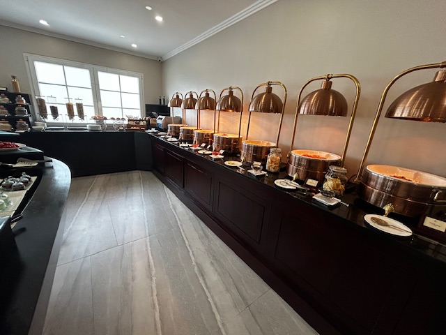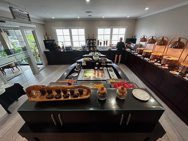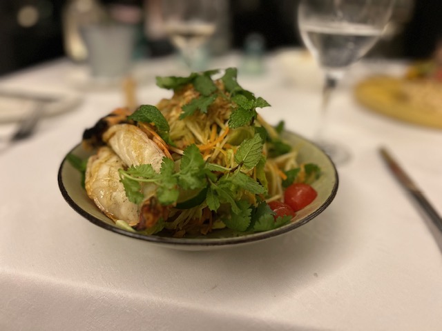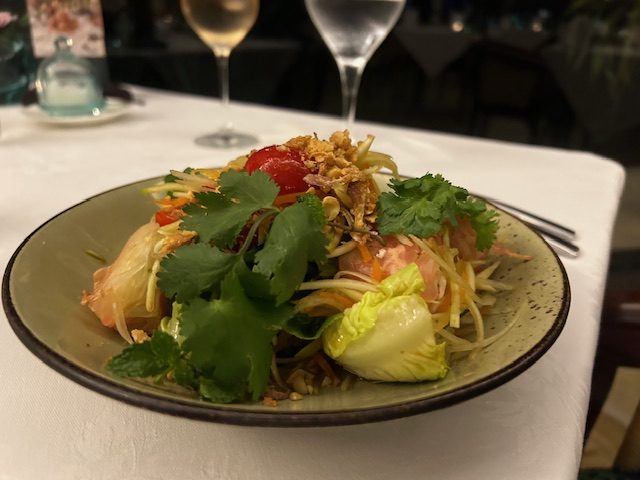 Das Tagesrestaurant Cascade ist der zentrale Anlaufpunkt für Frühstück und casual Speisen über Mittag und Abend. Alle Speisen die diese Einrichtung verlassen sind ausnahmslos lecker, auf den Punkt, authentisch und von guter Qualität. Es ist wirklich beeindruckend was hier von Seiten des F&B Departments, am anderen Ende der Welt wohlgemerkt, die Küche verlässt. Das fängt schon mit dem Frühstücksbuffet an, dass in einem extra klimatisierten Raum bereitgestellt wird. Joghurts, Säfte, Früchte, a la carte Eierspeisen, hausgemachte Hashbrowns, knuspriger Bacon (aus Australien), eine gute Brotauswahl, Croissants, Pain au chocolate, in Summe ist alles sehr gut, vielleicht mit kleinen Abstrichen bei der Saftqualität. Der Kaffee kommt aus einem Siebträger a la minute gebrüht an den Tisch, wer lieber Tee bevorzugt hat definitiv auch kein Problem. Zu Mittag wählen wir grünen Papayasalat mit Garnelen, der mit dicken Grapefruitstücken und Koriander maximal lecker ist. Man glaubt es kaum, die Pizzen sind an Qualität nicht zu überbieten. Da kann sich so manchen hiesiger Italiener noch was abschauen, knusprig lecker mit feinen Zutaten von hochwertigen schwarzen Oliven, Fetakäse oder Knoblauch Confit. Das Steaksandwich würde ich persönlich etwas anders zubereiten, es ist aber auch zugegeben eine Anmerkung auf hohen Niveau. Am Pool sitzend bekommt man neben einem obligatorischen Glas Wasser, auf Bestellung leckere Reisblätter, die gefüllt mit Gemüse, Tofu und oder Garnelen sind. Dazu eine süß-saure-scharfe Soße zum dippen und schon vergeht der kleine Hunger im Sekundenflug.