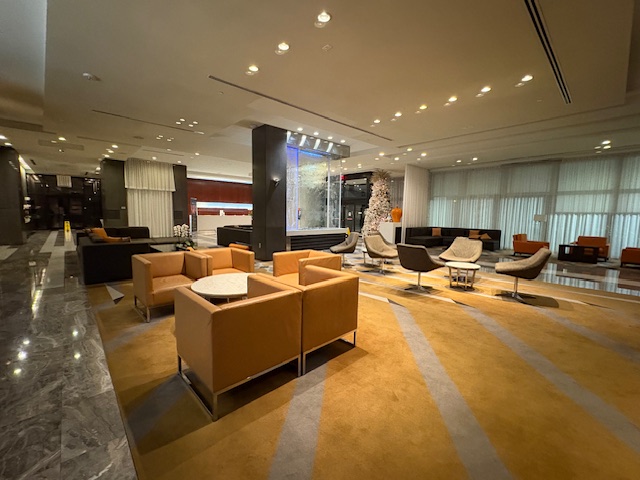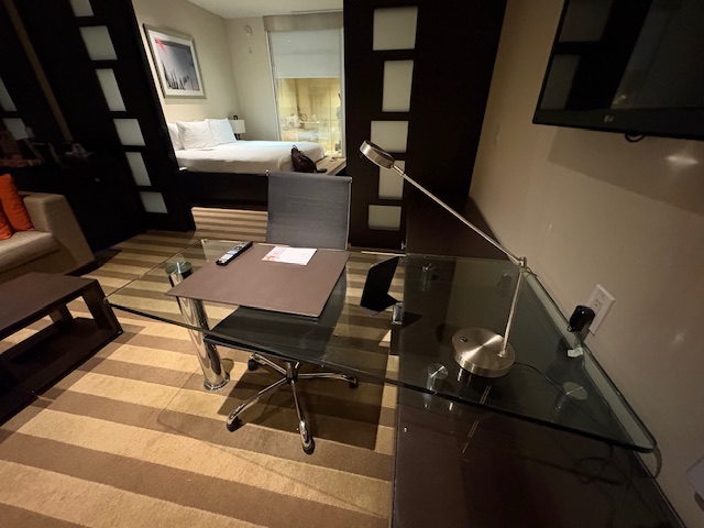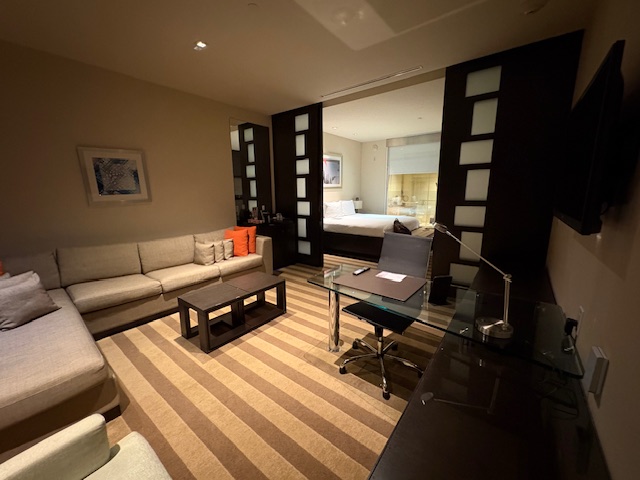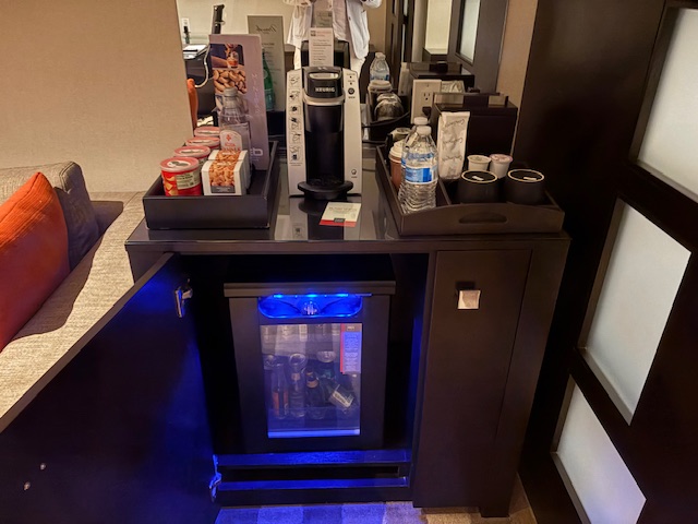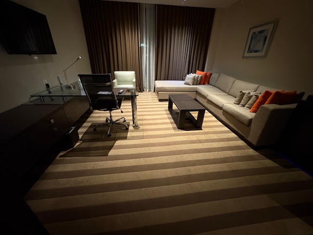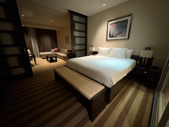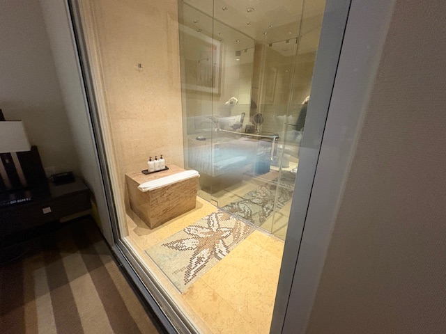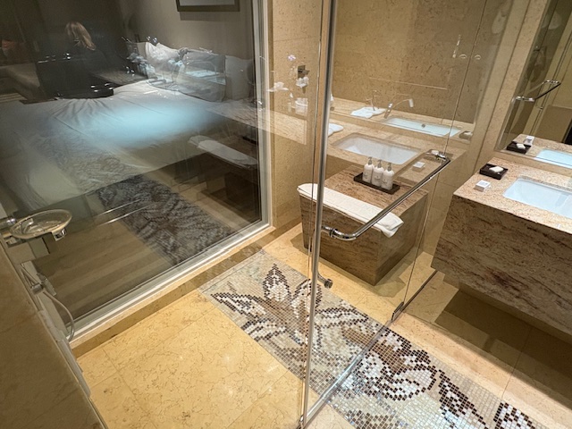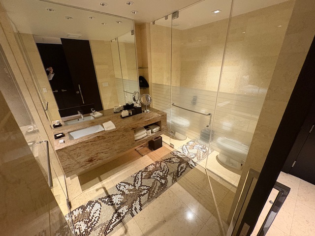 Erfolgt am Abend und ist effizient. Keine Gästeschlange und prompt hält man die Zimmerkarte in der Hand. Per Aufzug geht es in die 7. Etage, beim Eintreten in das Zimmer fällt auf wie groß dieses ist. Rund 45 Quadratmetern sind doch und speziell bei nur einer Nacht völlig ausreichend. Das Badezimmer mit Rainforest Dusche ist ebenfalls komfortabel und großzügig ausgestattet und auch sonst gibt es viel an Stauraum.