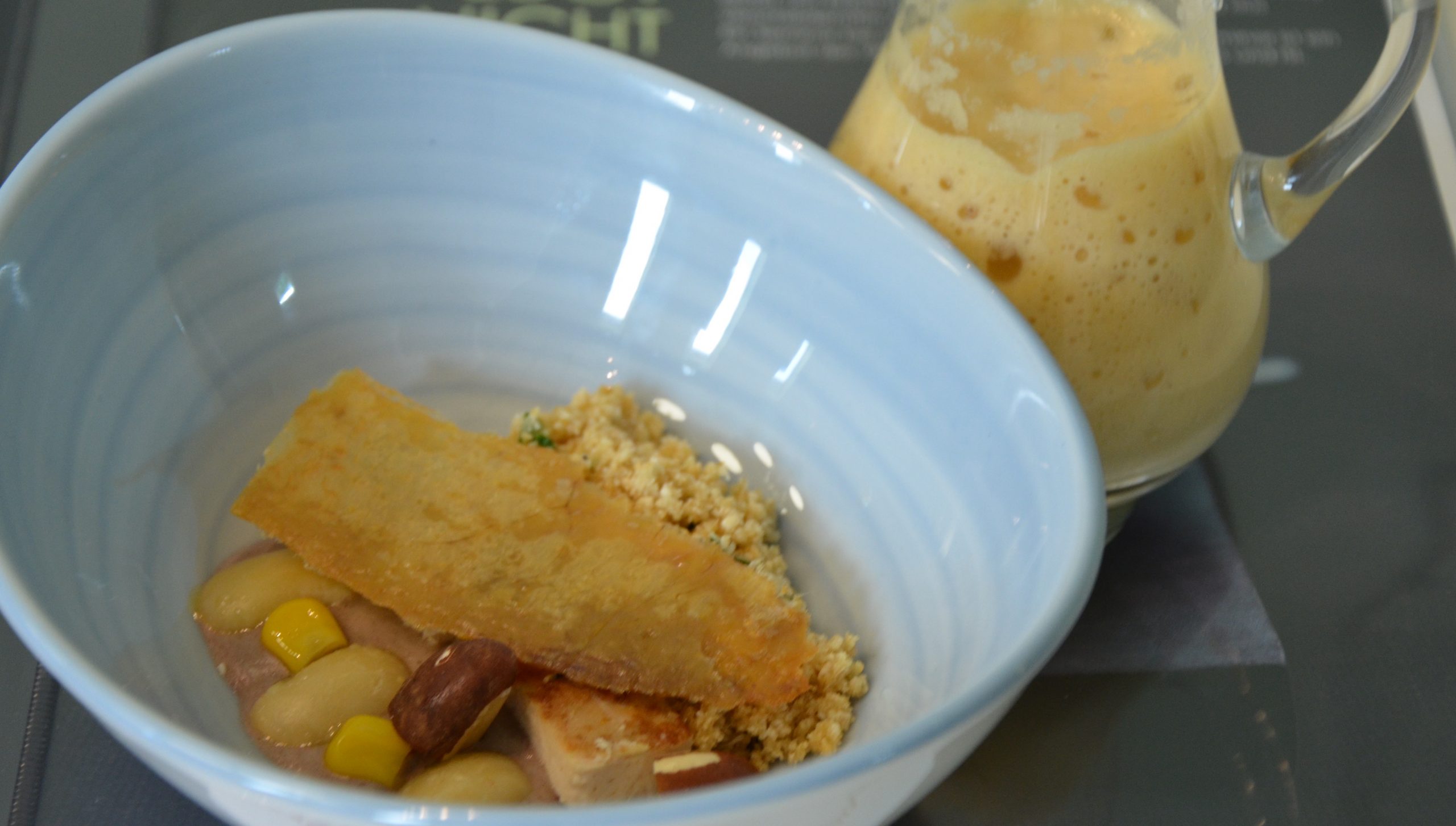 Die Inspiration war meine Südamerika Reise, wo sich japanische Einflüsse in Peru, die Kartoffelhistorie des Landes und Maniok treffen. Der Anspruch war auch ein weites Feld von Texturen zu bieten. „Crispy“ der Maniok und die Hühnerhaut, weich nussig schmeckend ein Bohnenpüree, wie es die Mexikaner kochen und die sous-vide gegarte marinierte Biohühnerbrust, sowie am Schluss mit etwas Zitronensaft beträufelt.