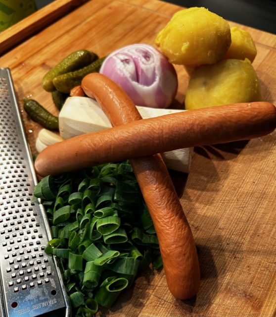 600 g festkochende Kartoffeln mit Schale und etwas Salz kochen – 1 Roscoff Zwiebel, diese ist wesentlich leckerer, saftiger und fester als gewöhnlich Zwiebeln – 1 Knoblauchzehe – – 12 Kirschtomaten für etwas Farbe – 1 Eßlöffel Schnittlauch oder Frühlingszwiebel Ringe – Salz und Pfeffer aus der Mühle sowie frisch geriebene Muskatnuss – 6 kleine Gewürzgurken (Cornichons) – sowie 3-4 Eßlöffel von der Essiglauge für die Vinaigrette – 6 Eßlöffel milden Weißwein Essig – 12 Eßlöffel kalt gepresstes Rapsöl – 1 TL Senf – – 100 ml Gemüsebrühe – frisch gehobelten Meerrettich – 4 Wienerle im optimalen Fall in Bioqualität