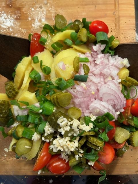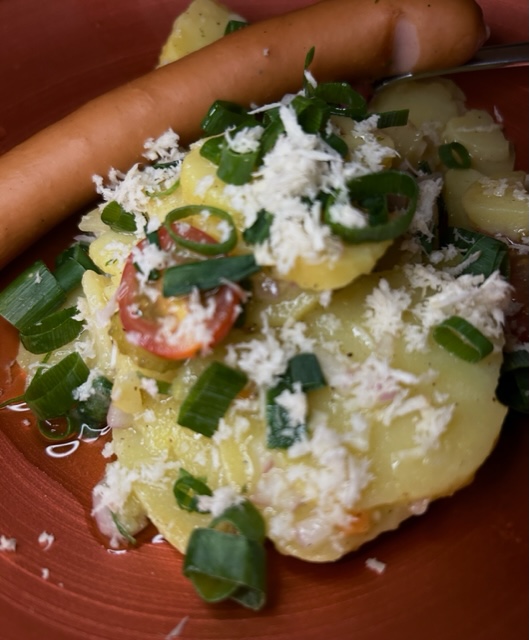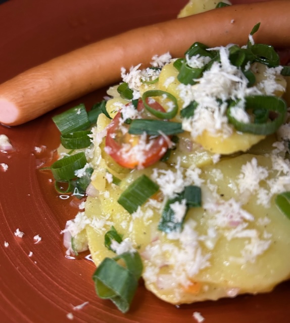 600 g festkochende Kartoffeln mit Schale und etwas Salz kochen – 1 Roscoff Zwiebel, diese ist wesentlich leckerer, saftiger und fester als gewöhnlich Zwiebeln – 1 Knoblauchzehe – – 12 Kirschtomaten für etwas Farbe – 1 Eßlöffel Schnittlauch oder Frühlingszwiebel Ringe – Salz und Pfeffer aus der Mühle sowie frisch geriebene Muskatnuss – 6 kleine Gewürzgurken (Cornichons) – sowie 3-4 Eßlöffel von der Essiglauge für die Vinaigrette – 6 Eßlöffel milden Weißwein Essig – 12 Eßlöffel kalt gepresstes Rapsöl – 1 TL Senf – – 100 ml Gemüsebrühe – frisch gehobelten Meerrettich – 4 Wienerle im optimalen Fall in Bioqualität