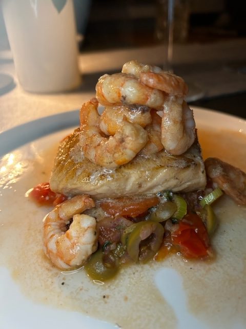 Die Kirschtomaten waschen und halbieren. Aus der Schalotte feine Würfel schneiden und in etwas Öl anschwitzen und die halbierten Tomaten, die Chiliringe sowie die Oliven hinzugeben. Den Lachs und die Garnelen auf Raumtemperatur bringen, dann zuerst den Fisch von jeder Seite 2-3 Minuten rosa braten. Die Garnelen ab Minute 1 hinzugeben bis sie schön glasig sind. Mit Salz, Pfeffer und dem fein gehackten Knoblauch würzen. Final etwas Butter in die Pfanne geben und mit frischem Zitronensaft abschmecken.