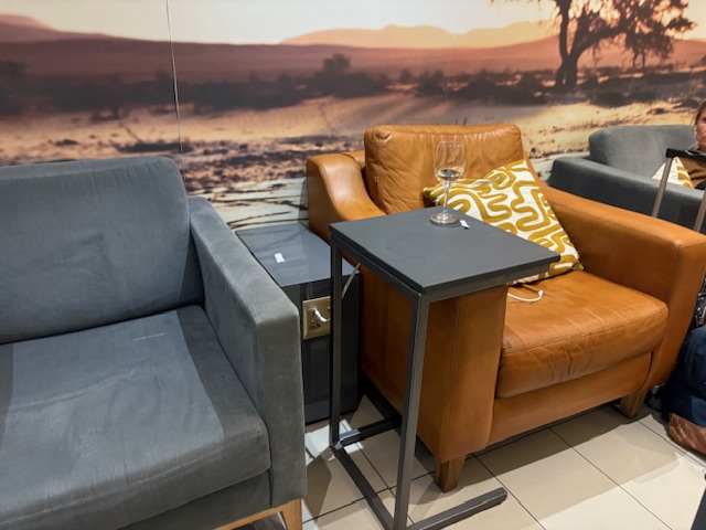 Danach ist die Sitzplatz-Verfügbarkeit recht schwierg, die Location ist klein und hat ungefähr an die 60 Plätze. An diesem Abend verlassen 2 Discover Flüge Namibia, eine Maschine geht um 19:30 nach Frankfurt, die andere geht um 20:50 nach München. Alleine diese 2 A 330 haben 60 Business Class Sitze, dazu gesellen sich andere Flüge, zum Beispiel nach Botswana oder Capetown. Also ist es keine Überraschung das es voll wird! Die Lounge ist ebenerdig direkt neben der Start- und Landebahn und erinnert ein wenig an meinen Aufenthalt auf Rarotonga, in der Südsee.