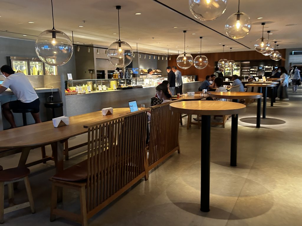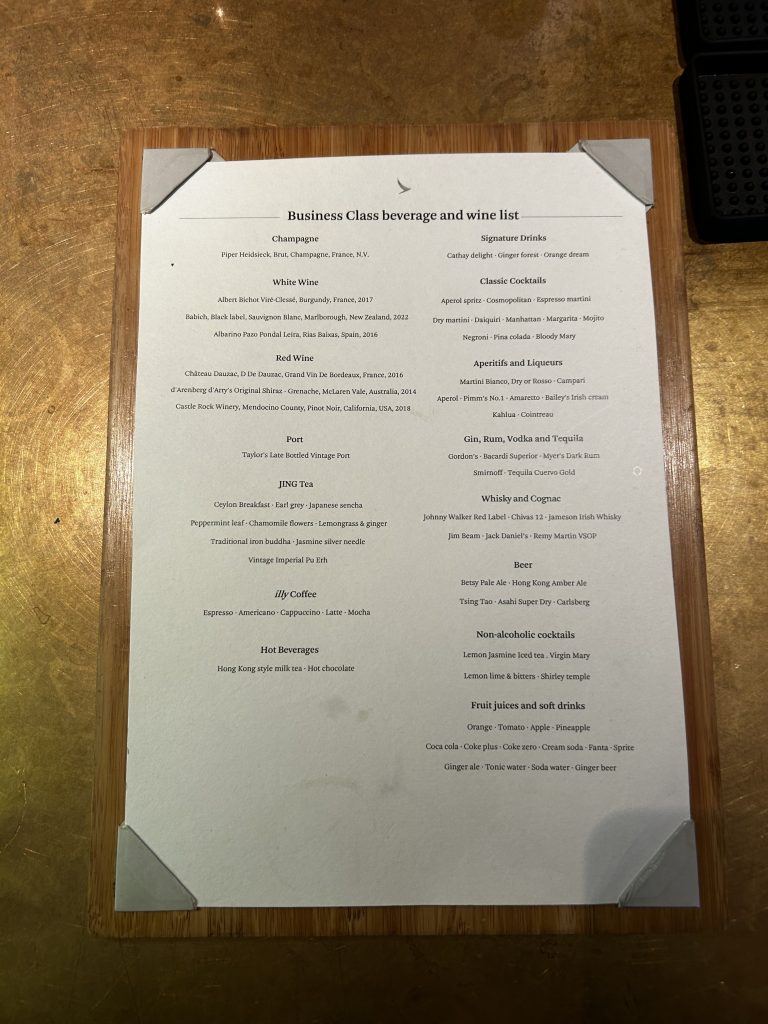 F&B hinterlässt hier gleich von Anfang an einen respektablen Eindruck! Die Food Hall bietet neben einem Kaffee-Barista-Wagen, ein bedientes Buffet mit a la minute gebackener Pizza, Salaten und Toppings. An der Bar werden sehr gute Weine, Champagner und Cocktails ausgeschenkt. Der Non Vintage (NV) Piper Heidieck perlt ganz vorzüglich im Glas, etwas zitronige Noten und gut balancierte Mineralik machen ihn zu einem sehr guten Cuveé. Auch sehr zu empfehlen ist der vom Weingut Babich gekelterte Sauvignon Blanc aus Neuseeland. Hab ich schon erwähnt das es von Hongkong eigentlich nur noch 13 Flugstunden in das Land der Kiwis ist? Also „half-way“, wenn die Reise von Europa aus startete und Cathay Pacific als national Carrier wäre definitiv ein angenehmer Weg in Business Class nach down under zu fliegen. Aber nicht nur Wein ist hier angesagt, auch Klassiker wie ein Aperol Spritz, diverse Biersorten aus aller Welt bis hin zum Signature Drink dem Cathay delight, einem Mix aus Ginger Forest und Orange.