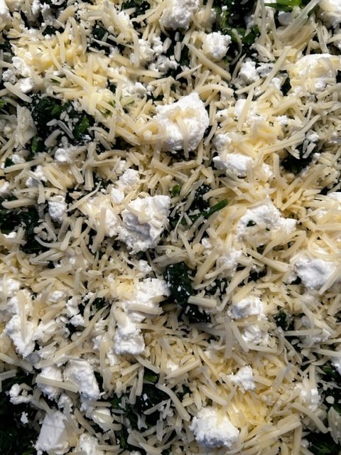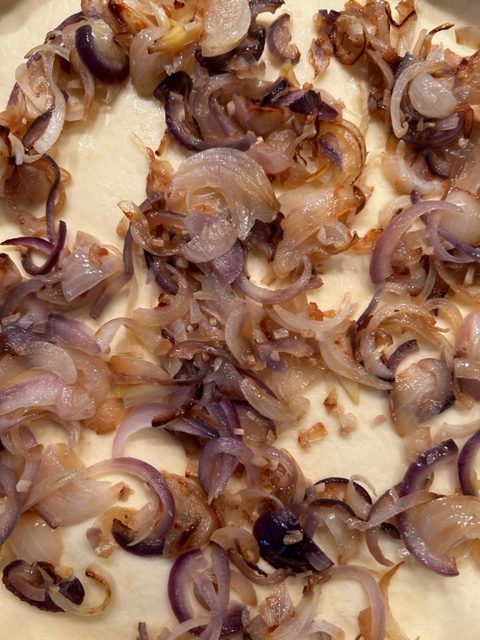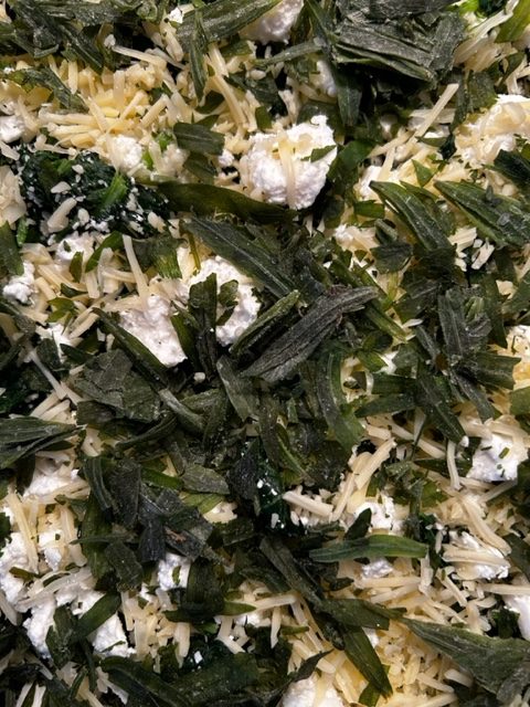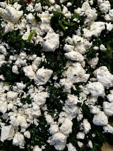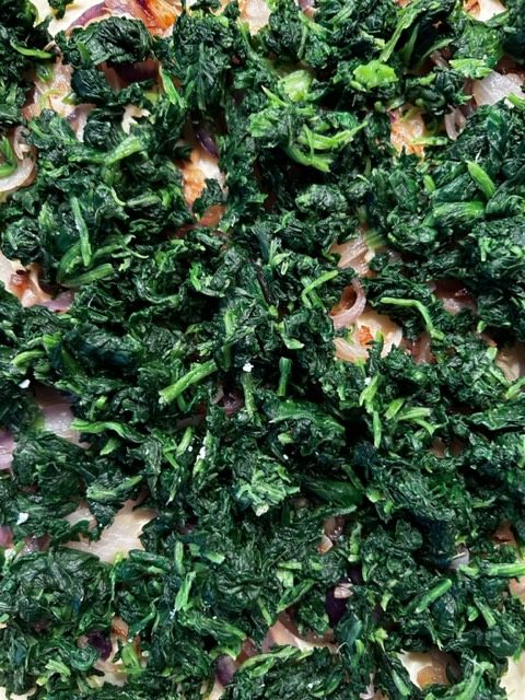 Die Zubereitung ist eigentlich recht einfach. Zuerst schält man die Zwiebeln und den Knoblauch. Diese schwitzt man im Öl an und dünstet darin die in Streifen. Die runde Form wird mit dem Mürbeteig ausgelegt, mit den Zwiebeln, dem aufgetauten und ausgedrückten (!) Spinat wird ausgelegt. Des weiteren kommt der zerbröselte Schafskäse dazu und anschließend kommt die Royal, ja jetzt wird es tatsächlich königlich, hinzu. Was ist eine Royal wird sich der eine oder die andere fragen? Nun es sind im Prinzip die aufgeschlagenen Eier, die mit der Milch oder der Sahne zusammen verquirlt werden. Das Gemisch würzt man mit Salz und Pfeffer, dann gießt man entsprechend diese Flüssigkeit in die belegte Backform, streut die Estragon Blätter darauf, legt ein paar dünne Tomatenscheiben auf. Danach wird der „Kuchen“ bei ca. 180 Grad Umlufttemperatur für 35-40 Minuten im hauseigenen Ofen gebacken.