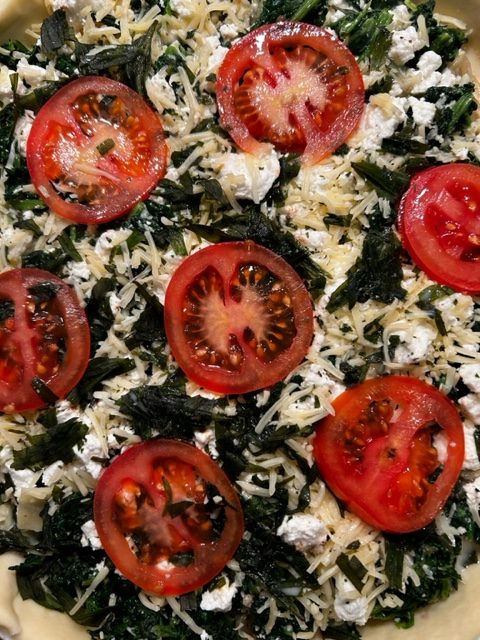 Einen runden Mürbeteig aus dem Kühlregal – 2 ganze Bio-Eier – 125 g zerbröselten Bio-Schafskäse – 2 Zwiebeln – 20 Sojaöl – 2 EL frische Estragonblätter – 2 Knoblauchzehen – 200 ml Bio-Milch – Salz und Pfeffer aus der Mühle – 250 g Blattspinat aus der Tiefkühltruhe – 150 g Bio-Reibekäse – 1 Tomate