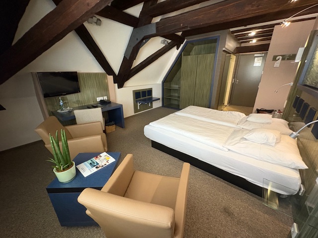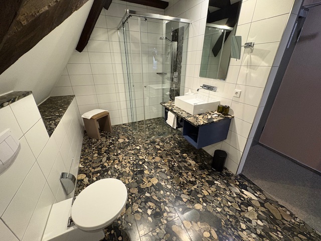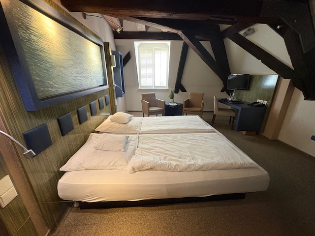 Gebucht ist ein Doppelzimmer unter dem Dach. Im direkt daneben liegenden alten Rathaus sind 7 Zimmer im Jahre 2016 aufwendig integriert worden, der Eingang und die Pracht der Fachwerkhäuser hinterlassen definitiv Eindruck. Das Badezimmer ist mit ausreichend Platz gestaltet worden, das Wasserbett empfinden wir hingegen gewöhnungsbedürftig. Bei jeder Bewegung fühlt man sich wie auf einer Welle, was doch etwas ungewöhnlich erscheint als Matratzenschläfer.