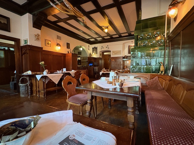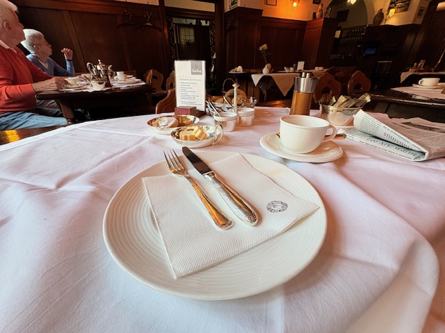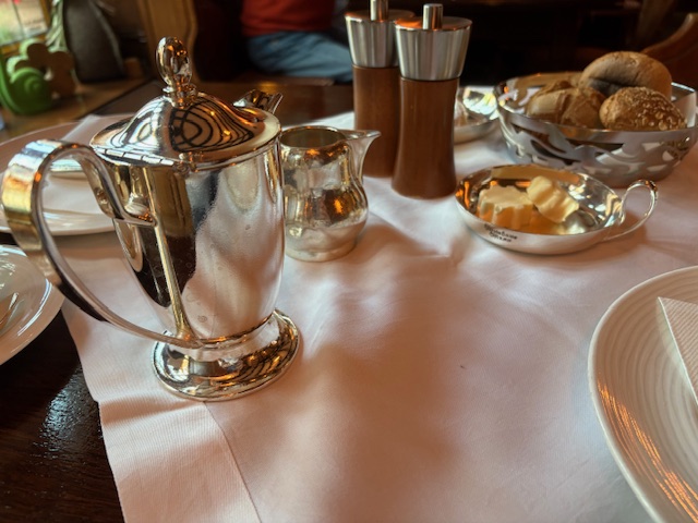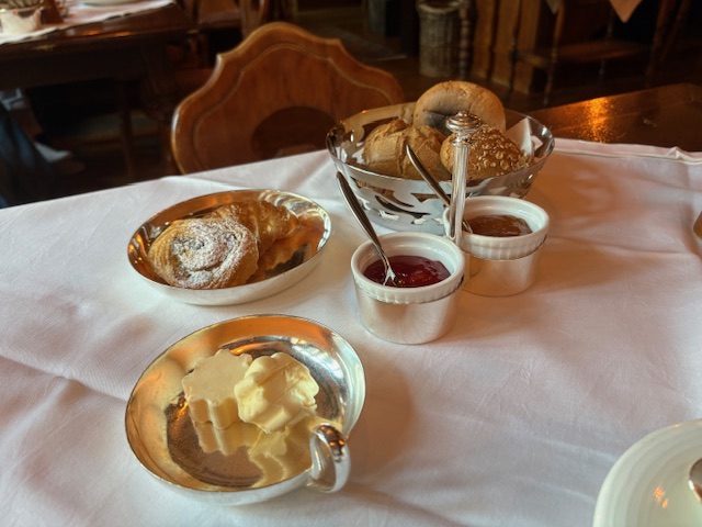 Ist eine Art à la carte. Es gibt kein Büffet, dafür an jedem Tisch eine kleine Speisekarte mit dem klassischen Angebot von Orangensaft bist Bircher Müsli. Eierspeisen werden ebenfalls à la minute gekocht und der Kaffee, die Milch, als auch die Marmelade kommt noch sehr, sehr klassisch in echtem Silber daher. Der Service ist aufmerksam ohne dabei aufdringlich zu wirken. Alle Tische sind in der historischen Gaststube belegt, was für eine gute Resonanz spricht.