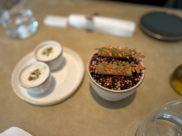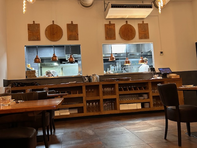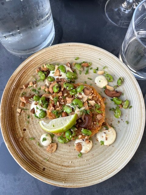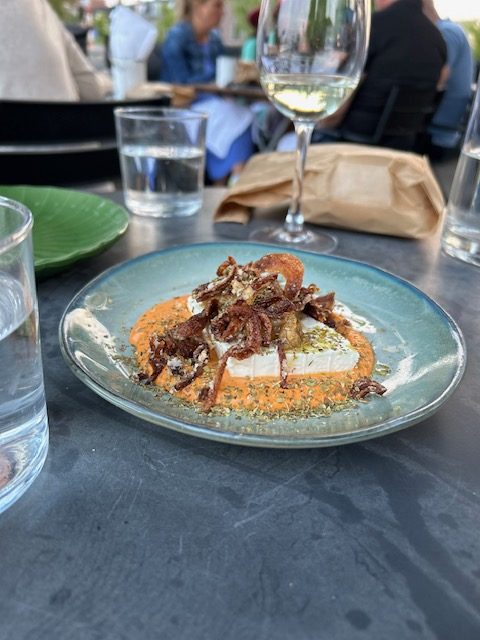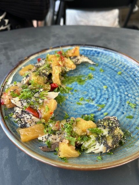 Wow, was für eine schöne location direkt am Kanal, auch Hafen wenn man es so nennen will. Überall sind Schiffe am Ufer, die entweder noch genutzt werden oder als Restaurant/Cafe dienen. Was in dieser Location geboten ist ist wirklich handwerklich lecker gekocht und präsentiert. Der Service ist aufmerksam und kompetent. Das Brot wird in Tüten gereicht, nicht immer die hygienischste Art aber cool. Wir bestellen 2 x 3 Gänge, wählen hierfür die knusprige Schweinebacke mit Krabbensalat, Soja und Sesam – ein Traum! Das Gamba Tatar kommt so „UMAMI“ daher, mit grüner Currypaste, dass man allerdings nichts mehr von der Garnele selbst schmeckt-schade-aber trotzdem sehr lecker! Der servierte Feta mit Paprika Creme könnte etwas temperiert sein, ist allerdings in Kombi mit den knusprigen Zwiebeln und der Aubergine ein Gedicht. Fitto Misto mit Aioli geht immer, die Garnele taucht in die Sauce ein und es knuspert zwischen den Zähnen, die frische Zitrone liefert den Gegenpol – genial! Das geräucherte Sirlon-Steak hauchdünn aufgeschnitten und mit Orangen-Hosion-Sauce sowie einem Wildkräutersalat angerichtet schmeckt, auch wenn ich zugeben muss den Räuchergeschmack zu vermissen. Egal, einfach lecker! Der Star des Abends ist für mich die geräucherte Makrele, ja richtig, simple und lecker, serviert mit einem spicy Ananas-Salsa, Schalotten und rosa Pfeffer. #keepitsimple