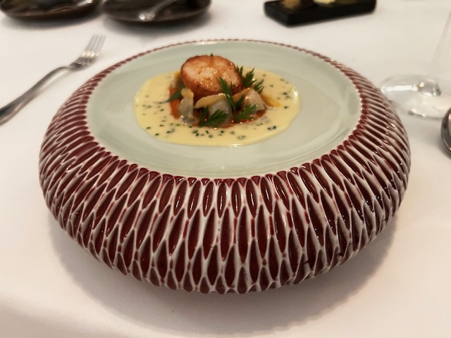 Die nun folgende Hokkaido Jakobsmuscheln mit einer legierten Fischsuppe (Chowder) und Ananas-Sambal, sowie Clams-Muscheln ist elegant und sehr dezent gehalten. Die Textur der im Kern rohen Muschel gepaart mit Chili und der Frische und Süße von lokaler Ananas sind sehr überzeugend. Dazu der Klassiker einer gebundenen, cremigen Fischsuppe verbindet Tradition mit Avantgarde.