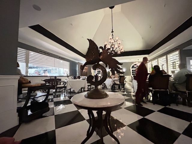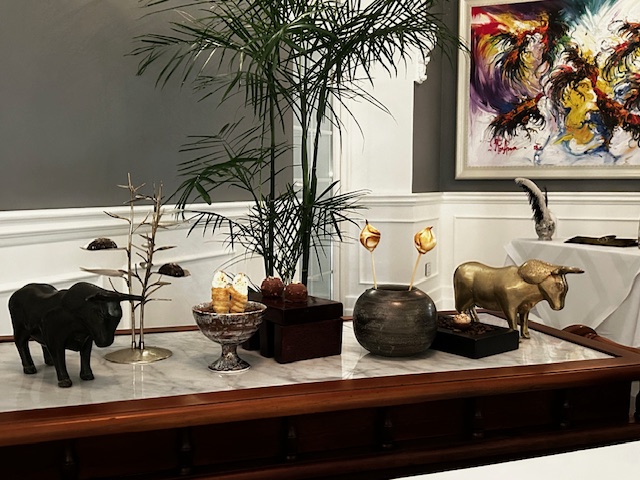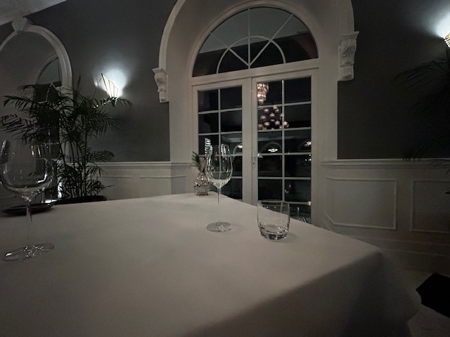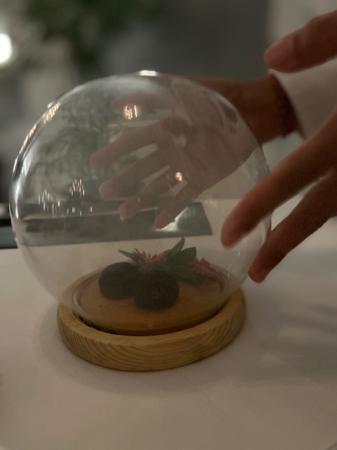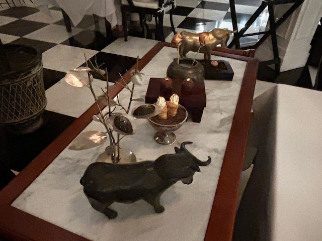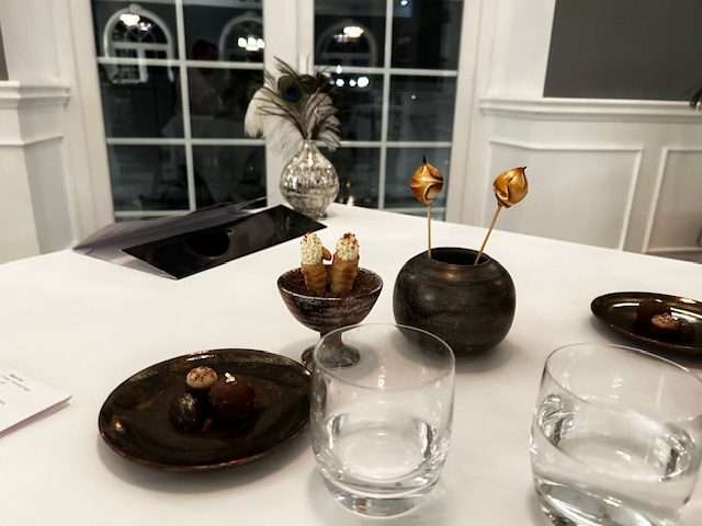 Wenn man denkt das der Abend zu Ende ist, dem bringt die Patisserie-Chefin eine Auswahl an Pralinen vorbei. Die ist nicht plumb auf einem Teller angerichtet, sondern wird zwischen Zink-Ochsen und kleinen Baumästen auf einem Wagen zelebriert. Auch hier sind wieder nur beste Schokoladen Produkte verarbeitet, welche auf der Zunge nur so dahin schmelzen.
