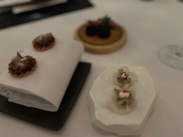 Dieses Restaurant ist vielleicht das beste in ganz Indonesien!? Aber wo fängt man an? Beim Interieur?Beim Dresscode der Kellner?Beim Walkin-Weinkühlschrank? Bei der offenen und somit einsehbaren Küche? Bei der im Stile der 20er und 30er Jahre gehaltenen Bar? Ein komplettes und stimmiges Konzept, dass durch und durch und vor allem Zuende gedacht ist. Weltklasse auf Bali! Welcher Kopf hat dies eigentlich soweit gebracht? Sicherlich ist es auf mehrere Schultern verteilt, da ist zum einen der Inhaber, aber wenn es kulinarisch wird vor allem der Belgier Nic Vanderbeeken, welcher hier schon 20 Jahre lang seine Spuren hinterlassen hat. Zudem ist er ein angenehmer Charakter, ich vermute das man es auch durchgängig so sein muss, wenn man mit den „locals“ so lange auf einem hohen Niveau arbeitet. Wir bestellen das Signature 7 Gang-Menü, schonmal vorab es wird uns nicht enttäuschen! Zum Aperitif werden Hühnchenlebermousse mit crispy Schalotten, gebeitzter Red Snapper (Fisch) mit Ponzu und Joghurt, ein Stück auf Holzkohle geräucherte Makrele und ein in Dashi eingelegter Pilz kredenzt. Ein Auftakt der sich zu 100% sehen lassen kann, Küchenleistung par excellence. Die verschiedenen Geschmacksebenen, egal ob die Säure im Joghurt, das tiefgründige der Leber oder der japanische Einfluss beim Pilz, die „Snacks“ sitzen!