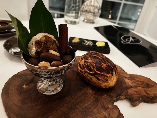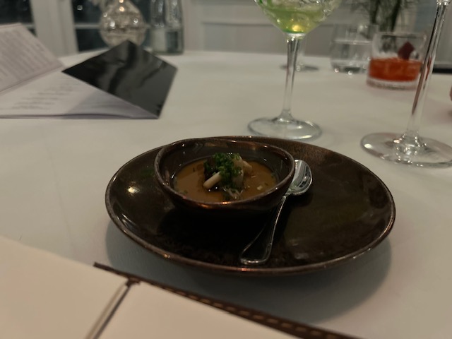 Die nun folgende Hokkaido Jakobsmuscheln mit einer legierten Fischsuppe (Chowder) und Ananas-Sambal, sowie Clams-Muscheln ist elegant und sehr dezent gehalten. Die Textur der im Kern rohen Muschel gepaart mit Chili und der Frische und Süße von lokaler Ananas sind sehr überzeugend. Dazu der Klassiker einer gebundenen, cremigen Fischsuppe verbindet Tradition mit Avantgarde.