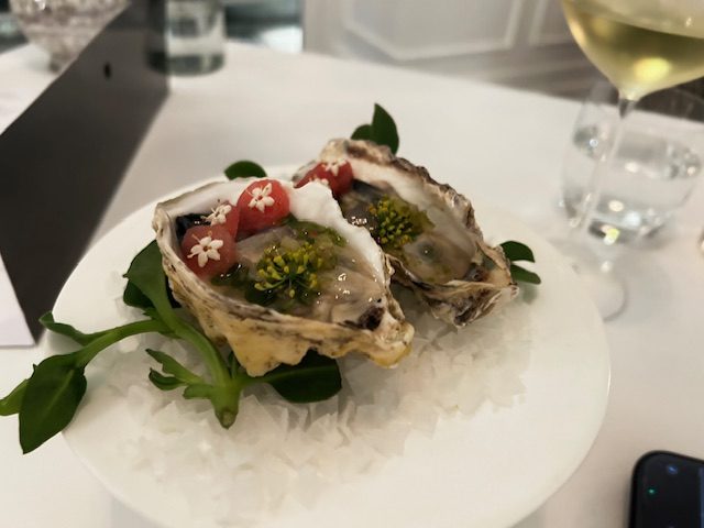Im nächsten Gang erwartet uns eine aus Japan eingeflogene Murotsu-Auster, die mit Wassermelone und dem lokalen Gewürz „Dabu-Dabu“ sowie Kemangi (Limonenbasilikum) in der Schale serviert wird. Optisch eine absolute Augenweide, nicht mehr und nicht weniger-fantastisch!