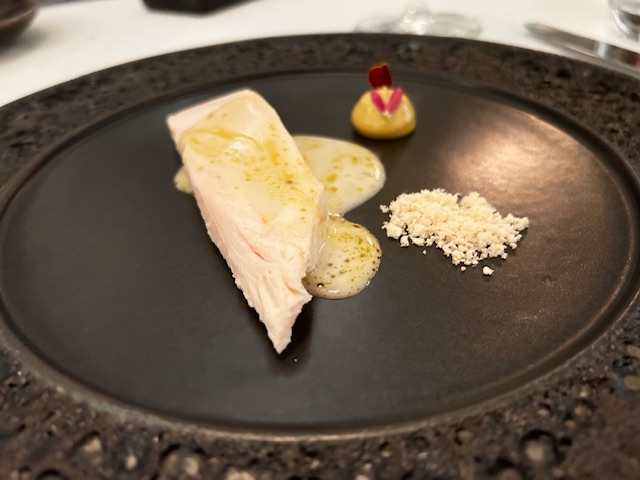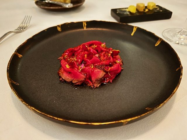 Der nächste Leckerbissen nennt sich „Wagyu“. Simple und schon alleine sehr aussagekräftig. Das japanische Beef ist von außen angegrillt, dann hauchdünn wie ein Carpaccio aufgeschnitten, mariniert mit schwarzen Knoblauch, Knochenmark und Senfsamen. Elegant, maximal zart, rosa und jedes Stück schmeckt zu 100 % wie man es vermutlich auch in Japan nicht besser essen kann. #outstanding
