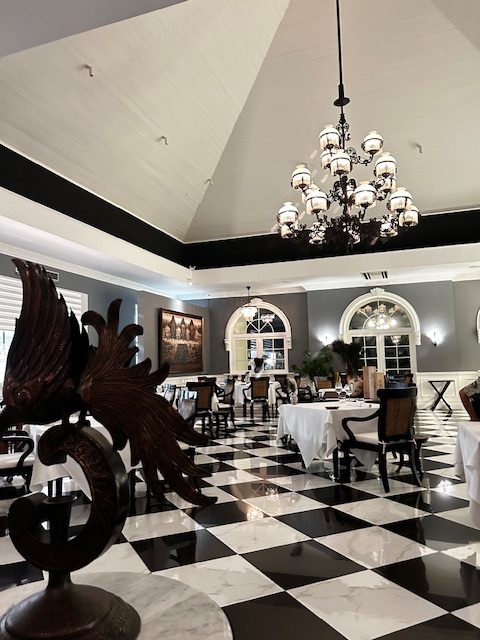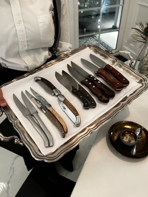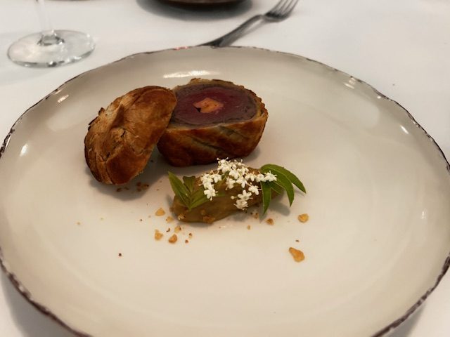 Im Hauptgang wählen wir den neuseeländischen Hirsch „Wellington“. Bevor diese Show losgeht, startet eine andere. Die Kellnerin kommt mit einem Tablet an den Tisch, auf dem verschiedene Messer zur Auswahl liegen. Der Gast wählt somit sein Schneidegeräte selber aus. Dann kommt der Klassiker der gehobenen Küche schlechthin, der Hirsch im Blätterteig mit Champignons (Duxelles) gegart. Auch hier arbeitet die Küche in Perfektion, von der Optik mit einem schimmernden Gänseleberkern, über den perfekten Garpunkt, bis zur Präsentation – alles Weltklasse mitten in Ubud auf Bali.