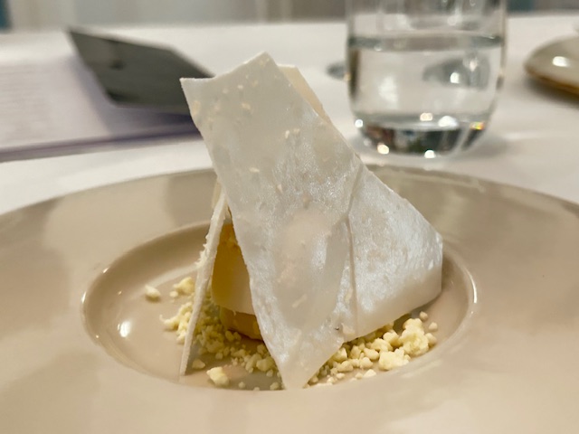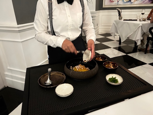 Es folgt das Spring Chicken welches im eigenen Sud im Niedertemperatur-Verfahren gegart wurde. Das Hähnchenfleisch ist fast schon weiss in seiner Optik und der Service am Tisch vollendet mit einer leicht hellen Geflügel-Sauce. Auf dem Teller findet sich zusätzlich Koya, was in Japan aus Soja hergestellt wird und Bumbu Kuning Reis, der vom Personal am Tisch auf einem extra Wagen und vor den Augen des Gastes zubereitet wird. Herausragend wie hier ein absolutes Topniveau zelebriert wird und den Gast perfekt unterhält, ohne jemals aufdringlich zu werden.