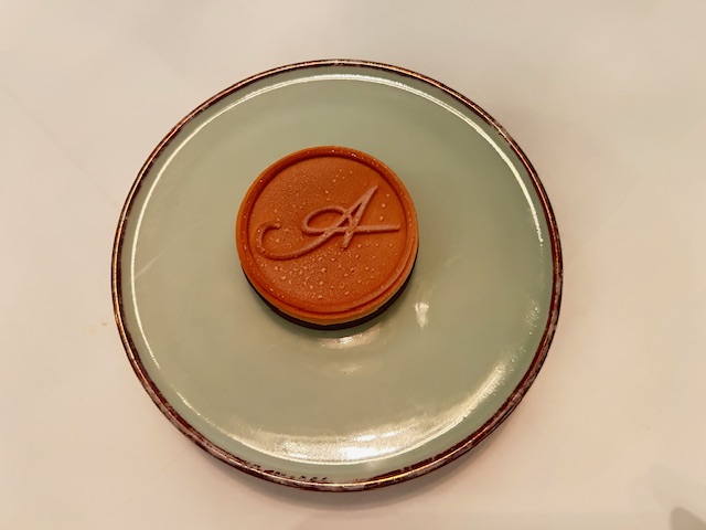 Aber weil die Party noch nicht vorbei ist, kommt zu allem kulinarischen Überfluss noch der Knaller schlechthin. Ein Erdnussbutter Mousse mit einem Himbeer-Brombeer Kern auf dem Keks serviert. Auf der Oberfläche ist ein großes „A“ dekorativ hinterlegt worden, was logischer Weise für Aperitif steht, dem Restaurant Name.