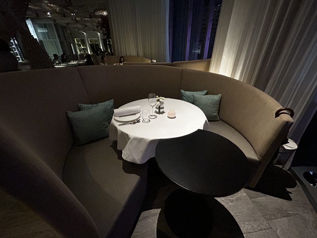 Einfach nur wow! Das bringt es eigentlich schon auf den Punkt, wenn man hier eintritt. Das elegante und moderne Design des Restaurants schafft eine einladende und sehr stilvolle Atmosphäre. Die Sitze sind mehrheitlich als Couch eingerichtet mit weniger Sitztiefe, rund in ihrer Form und bis Kopf- beziehungsweise zur Schulterhöhe. Dies gewährt somit eine herausragend gute Privatsphärebeim dinner. Der Tisch des Abends lässt auf die Leuchtreklame der gegenüberliegende Einkaufsmall centralWOrld schauen, so fängt das Entertainment schon vor dem ersten Bissen an!