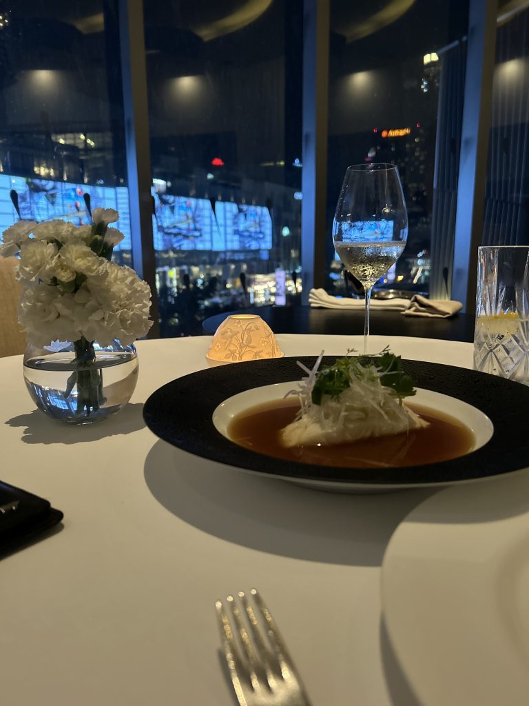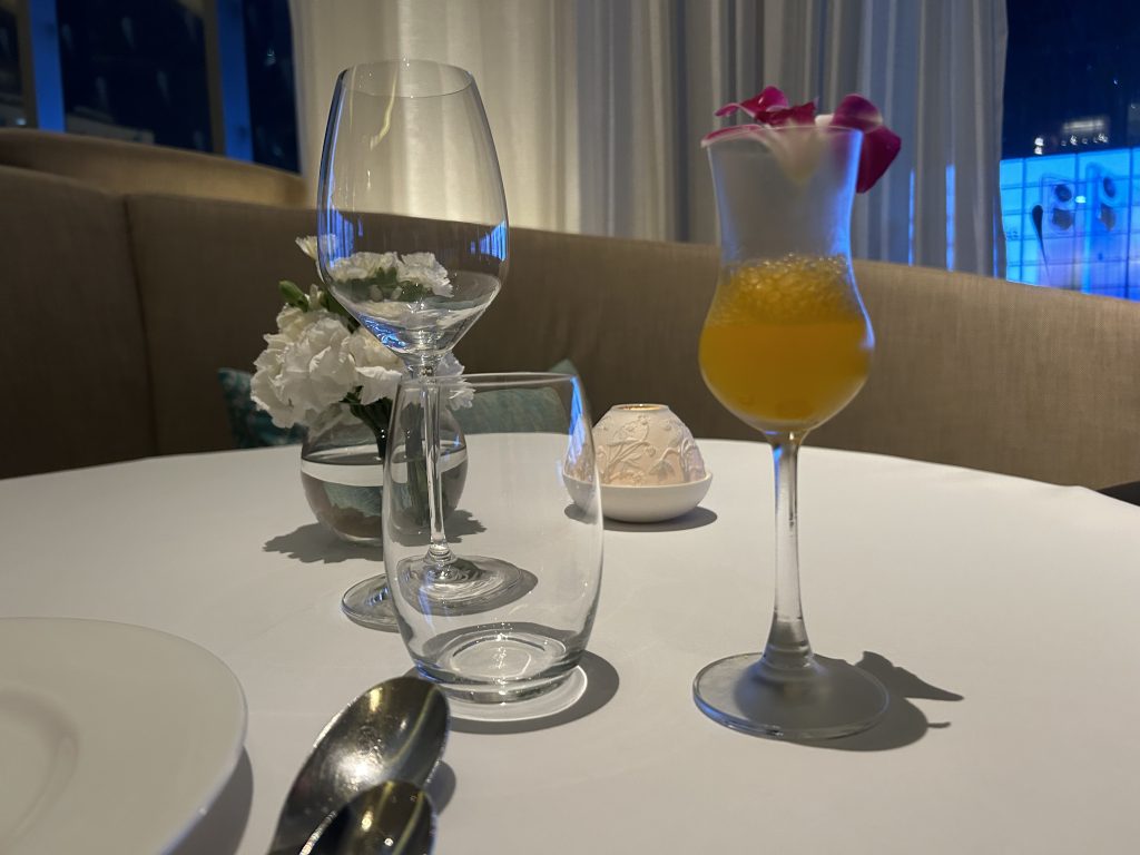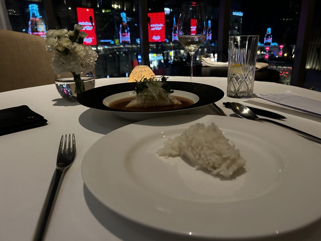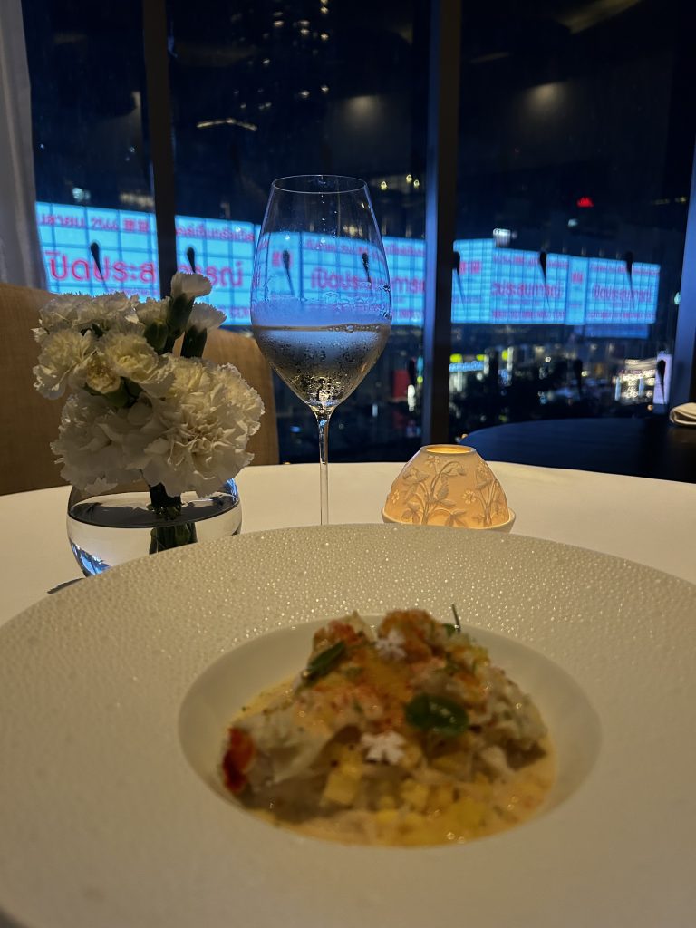 Einfach nur wow! Das bringt es eigentlich schon auf den Punkt, wenn man hier eintritt. Das elegante und moderne Design des Restaurants schafft eine einladende und sehr stilvolle Atmosphäre. Die Sitze sind mehrheitlich als Couch eingerichtet mit weniger Sitztiefe, rund in ihrer Form und bis Kopf- beziehungsweise zur Schulterhöhe. Dies gewährt somit eine herausragend gute Privatsphärebeim dinner. Der Tisch des Abends lässt auf die Leuchtreklame der gegenüberliegende Einkaufsmall centralWOrld schauen, so fängt das Entertainment schon vor dem ersten Bissen an!