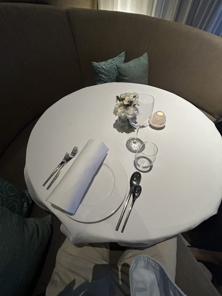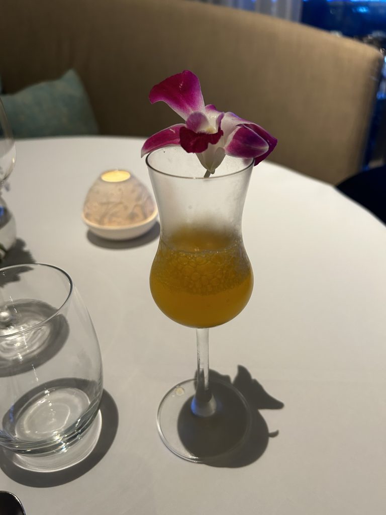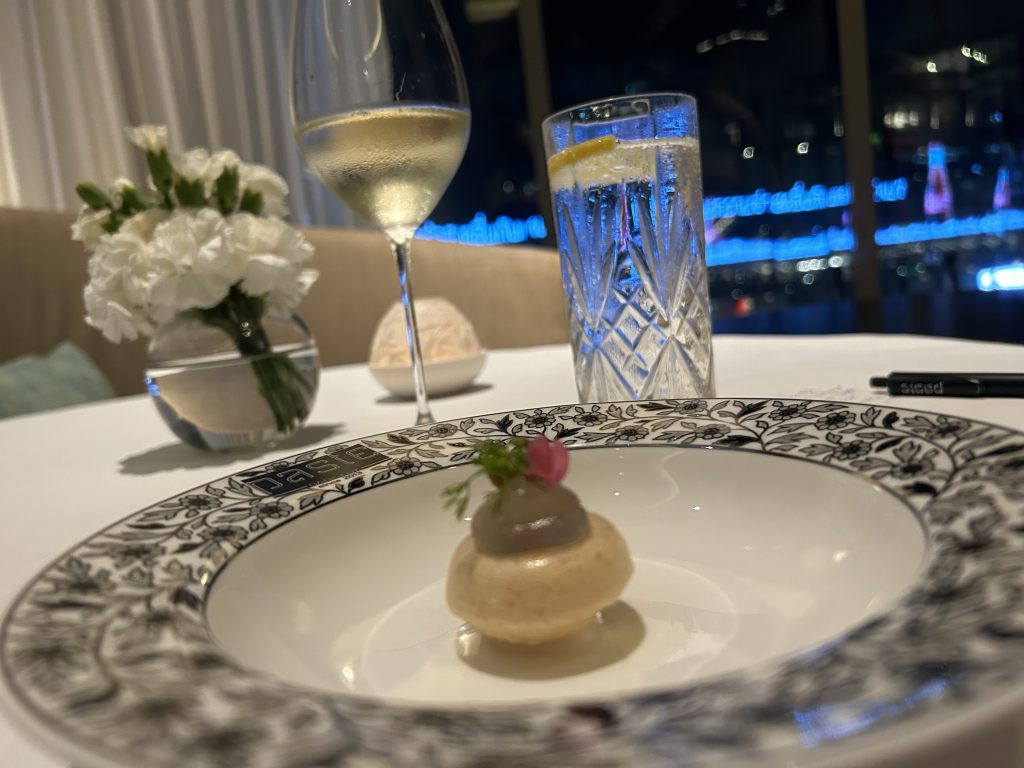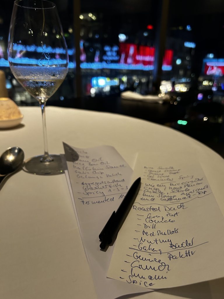Einfach nur wow! Das bringt es eigentlich schon auf den Punkt, wenn man hier eintritt. Das elegante und moderne Design des Restaurants schafft eine einladende und sehr stilvolle Atmosphäre. Die Sitze sind mehrheitlich als Couch eingerichtet mit weniger Sitztiefe, rund in ihrer Form und bis Kopf- beziehungsweise zur Schulterhöhe. Dies gewährt somit eine herausragend gute Privatsphärebeim dinner. Der Tisch des Abends lässt auf die Leuchtreklame der gegenüberliegende Einkaufsmall centralWOrld schauen, so fängt das Entertainment schon vor dem ersten Bissen an!