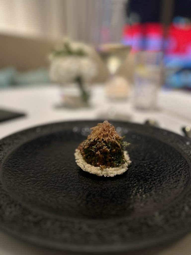 Als Amuse Bouche serviert man einen ultra knusprigen Rice Snack. Mundgerecht mit einem getrockneten Mini-Shrimp, abgeschmeckt mit einer Shrimps Paste, Limetten-Gel und Koriander. Es ist ein kleines Reis-Cracker-Feuerwerk, super frisch, etwas Schärfe und geschmacklich ein Rausch.
