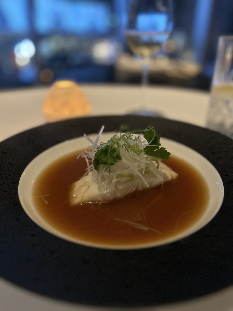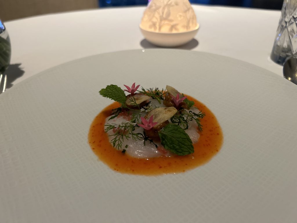 Was danach folgt ist die perfekte Dramaturgie von Schärfe. Die „Pulled (gezupfte) Ente“ mit Muskat, etwas mehr an Curry Paste, Dill, roten Schalotten-Confit und gemahlenen Galanga. Somit ist das nächste Highlight mit maximal intensiven Umami Noten, ohne trocken zu sein, garantiert. Die Klaviatur der Texturen beherrscht man schonmal im Paste, soviel ist sicher.