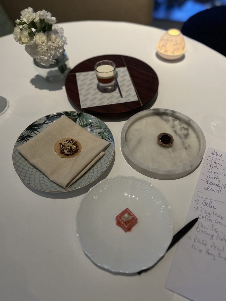 Um den Abend abzurunden serviert die Küche noch eine kleine Auswahl an Desserts. Die Variation besteht aus einem Black Bean Gelee im Glas, dem „Thai-Leaver“ mit Kaffee-Creme, einer kleinen mundgerechten Tarte – dem „black-pudding and berry rice“-Komposition, sowie einem weiteren kleinen quadratischen Gelee, dass mit Thai Tea und Orange parfümiert wird. Alles zusammen maximal lecker und gespickt mit verschiedenen Konsistenzen von knusprig bis schmelzend. Es ist klar zu erkennen welche Affination die Thai´s oder man in Südost-Asien zu Gelee hat, der Bubble Tea lässt grüßen.