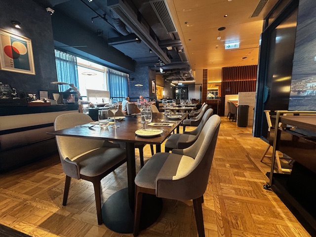Heimat by Peter Find liegt zentral und googlemaps hilft einem die 8/F, 33 Wyndham Street zu finden. Allerdings geht es erstmal ein paar Meter den Berg hinauf, bei den Temperaturen die in der Stadt nunmal vorherrschen, ist das schon ein kleiner Workout. Vor dem Gebäude angekommen erfolgt eine erneute Orientierung und schließlich bringt einen der Fahrstuhl in den schön gestalteten Empfangsbereich des Restaurans. Die Bar zur rechten-, der Gastraum vor einem liegend und die Küche mit dem Chefstable zur linken Hand.