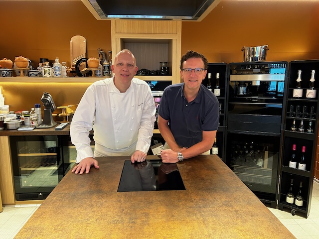 An diesem Tag ist auch der Chef vor Ort und aktiv im Service tätig. Die Einrichtung hat Klasse, ausgewählte sleake Tische und Stühle, einen Chefstable oder separate Räume für Veranstaltungen, laden mit der ganzen Herzlichkeit der Crew für schöne Stunden ein. Bei mir ist es ein Lunch, das ich mir aus dem a la carte Menu auswählen kann. Ich starte mit den Waldpilzen, einem 63 Grad Landei und einem so mir bekannten Käseschaum aus dem Siphon-Spender von iSi. Das dazu gereichte kleine Brotkunstwerk ist in Sachen Kruste und Geschmack nicht zu überbieten, es wird mit ein wenig Sauerrahm serviert. Im Anschluss bringt mir die Crew die Kohlroulade, etwas gröber gewolft wie man es so nicht unbedingt kennt, elegant im Geschmack mit lokalen Produkten gekocht. Beim ungarischen Gulasch geht die Küchenmannschaft um Peter einen besonderen Weg. Der wird nämlich mit Fleisch von geschmorten Rinderrippen gekocht. Mir wäre das persönlich garnicht aufgefallen, wenn da nicht die Struktur der Würfel anders als sonst wäre. Es ist ebenfalls und auch auf etwas lokale Verhältnisse angepasst, sehr sleak und nicht zu extrovertiert gekocht, was ich persönlich für eine gute Idee halte, um den lokalen Gästen geschmacklich nicht vor den Kopf zu stoßen! Die dazu gereichten Risoleekartoffeln und handgeschabten Spätzle machen auch die ganz hunrigen Menschen unter uns satt. Alles fügt sich gut in ein homogenes Geschmacksbild ein, so dass auch das Bier dazu, ein Zoller Zwickel, passt wie die bekannte Faust aufs Auge. Zum runden Abschluss serviert mir Peter seine Interpretation von der Schwarzwälder Kirschtorte, alles auf Mikroebene runtergebrochen, einem kleinen Küchlein, etwas geschlagener Sahne, ein wenig Textur durch die leckeren Schokoladen-Cakebrösel und nicht zu letzt auch durch die dazugehörende Kirsche!