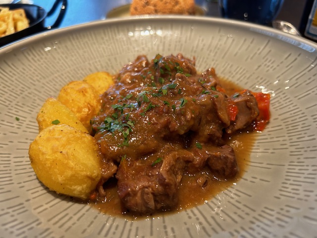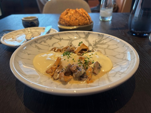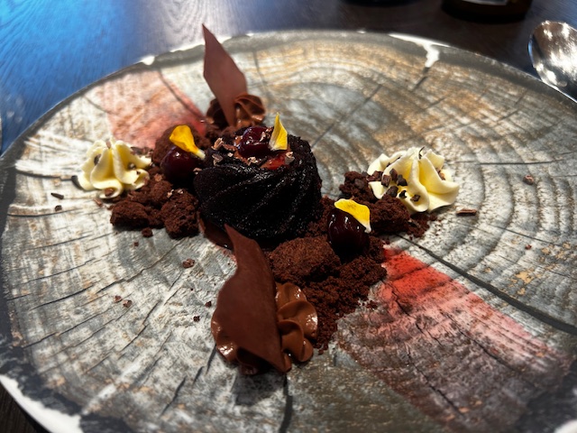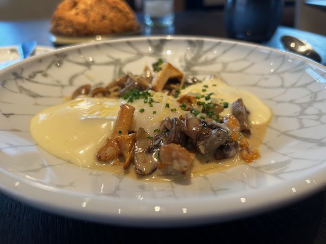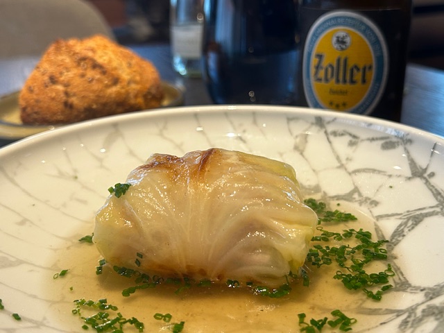 An diesem Tag ist auch der Chef vor Ort und aktiv im Service tätig. Die Einrichtung hat Klasse, ausgewählte sleake Tische und Stühle, einen Chefstable oder separate Räume für Veranstaltungen, laden mit der ganzen Herzlichkeit der Crew für schöne Stunden ein. Bei mir ist es ein Lunch, das ich mir aus dem a la carte Menu auswählen kann. Ich starte mit den Waldpilzen, einem 63 Grad Landei und einem so mir bekannten Käseschaum aus dem Siphon-Spender von iSi. Das dazu gereichte kleine Brotkunstwerk ist in Sachen Kruste und Geschmack nicht zu überbieten, es wird mit ein wenig Sauerrahm serviert. Im Anschluss bringt mir die Crew die Kohlroulade, etwas gröber gewolft wie man es so nicht unbedingt kennt, elegant im Geschmack mit lokalen Produkten gekocht. Beim ungarischen Gulasch geht die Küchenmannschaft um Peter einen besonderen Weg. Der wird nämlich mit Fleisch von geschmorten Rinderrippen gekocht. Mir wäre das persönlich garnicht aufgefallen, wenn da nicht die Struktur der Würfel anders als sonst wäre. Es ist ebenfalls und auch auf etwas lokale Verhältnisse angepasst, sehr sleak und nicht zu extrovertiert gekocht, was ich persönlich für eine gute Idee halte, um den lokalen Gästen geschmacklich nicht vor den Kopf zu stoßen! Die dazu gereichten Risoleekartoffeln und handgeschabten Spätzle machen auch die ganz hunrigen Menschen unter uns satt. Alles fügt sich gut in ein homogenes Geschmacksbild ein, so dass auch das Bier dazu, ein Zoller Zwickel, passt wie die bekannte Faust aufs Auge. Zum runden Abschluss serviert mir Peter seine Interpretation von der Schwarzwälder Kirschtorte, alles auf Mikroebene runtergebrochen, einem kleinen Küchlein, etwas geschlagener Sahne, ein wenig Textur durch die leckeren Schokoladen-Cakebrösel und nicht zu letzt auch durch die dazugehörende Kirsche!