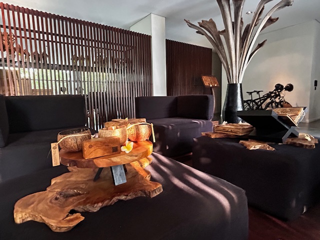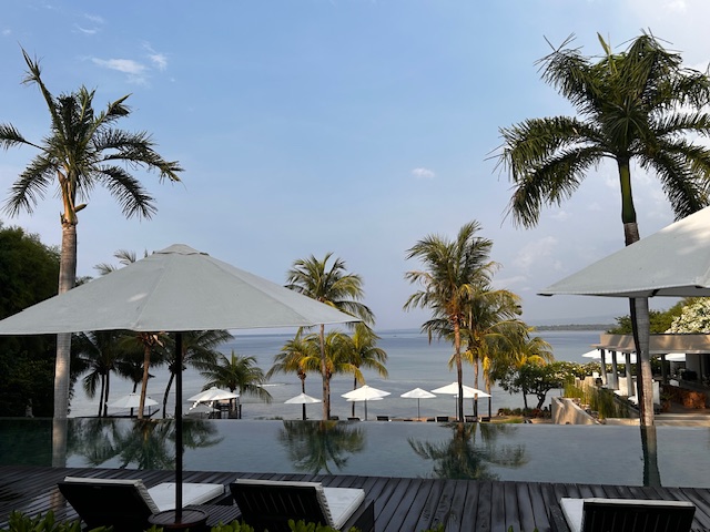 Das Resort, mit nur 9 Zimmern, bietet wirklich eine schöne Aussicht auf den indonesischen Ozean. Palmen säuseln leise im Wind, die Liegen warten auf die noch anzukommenden Gäste und man kann eigentlich nicht besser Essen und Trinken in dieser Umgebung. Die Gym ist nach meinem Geschmack etwas zu dunkel gehalten und vom Geruch erinnert sie an ein Hotelzimmer, beim dem sich das Fenster noch nie öffnen lies. Das geht deutlich besser und man kann sich das im Oberoi direkt um die Ecke auch anschauen. Der Strand und die Poolanlage ist ebenfalls nicht ganz so fesch und großzügig, auch hier punktet man nicht im Vergleich zum 5 Sterne Hotel um die Ecke.