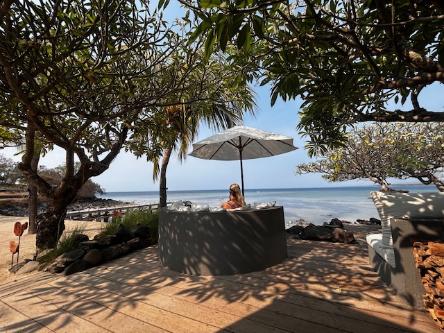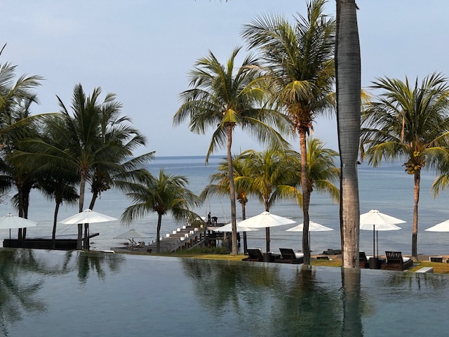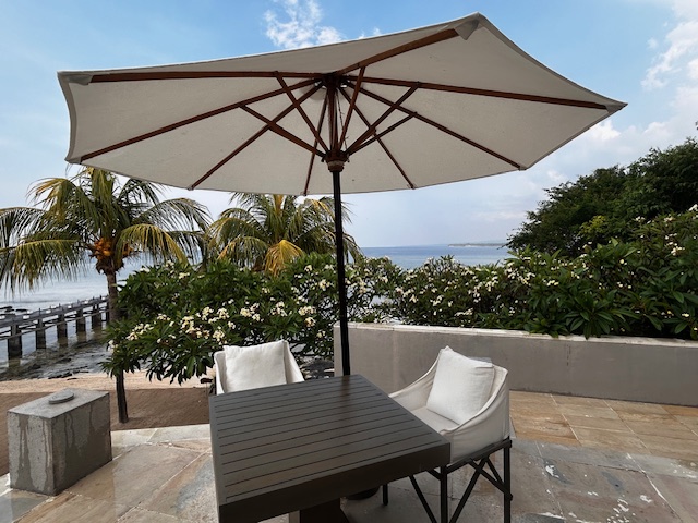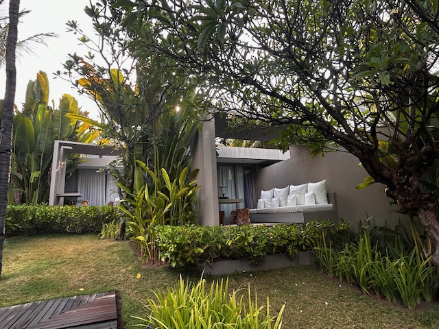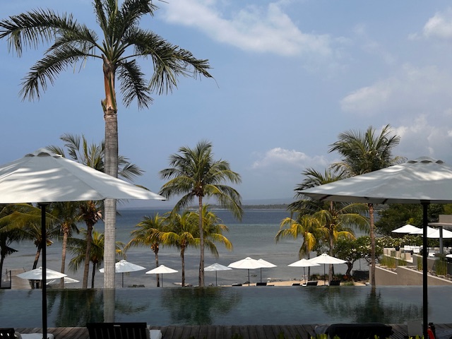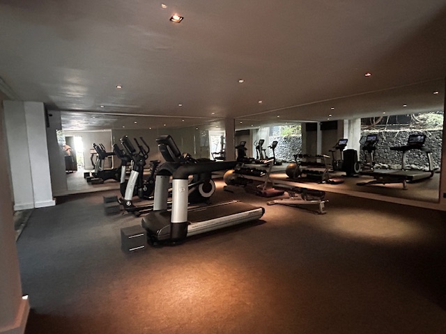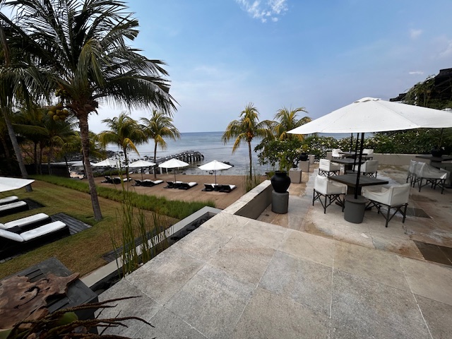 Das Resort, mit nur 9 Zimmern, bietet wirklich eine schöne Aussicht auf den indonesischen Ozean. Palmen säuseln leise im Wind, die Liegen warten auf die noch anzukommenden Gäste und man kann eigentlich nicht besser Essen und Trinken in dieser Umgebung. Die Gym ist nach meinem Geschmack etwas zu dunkel gehalten und vom Geruch erinnert sie an ein Hotelzimmer, beim dem sich das Fenster noch nie öffnen lies. Das geht deutlich besser und man kann sich das im Oberoi direkt um die Ecke auch anschauen. Der Strand und die Poolanlage ist ebenfalls nicht ganz so fesch und großzügig, auch hier punktet man nicht im Vergleich zum 5 Sterne Hotel um die Ecke.