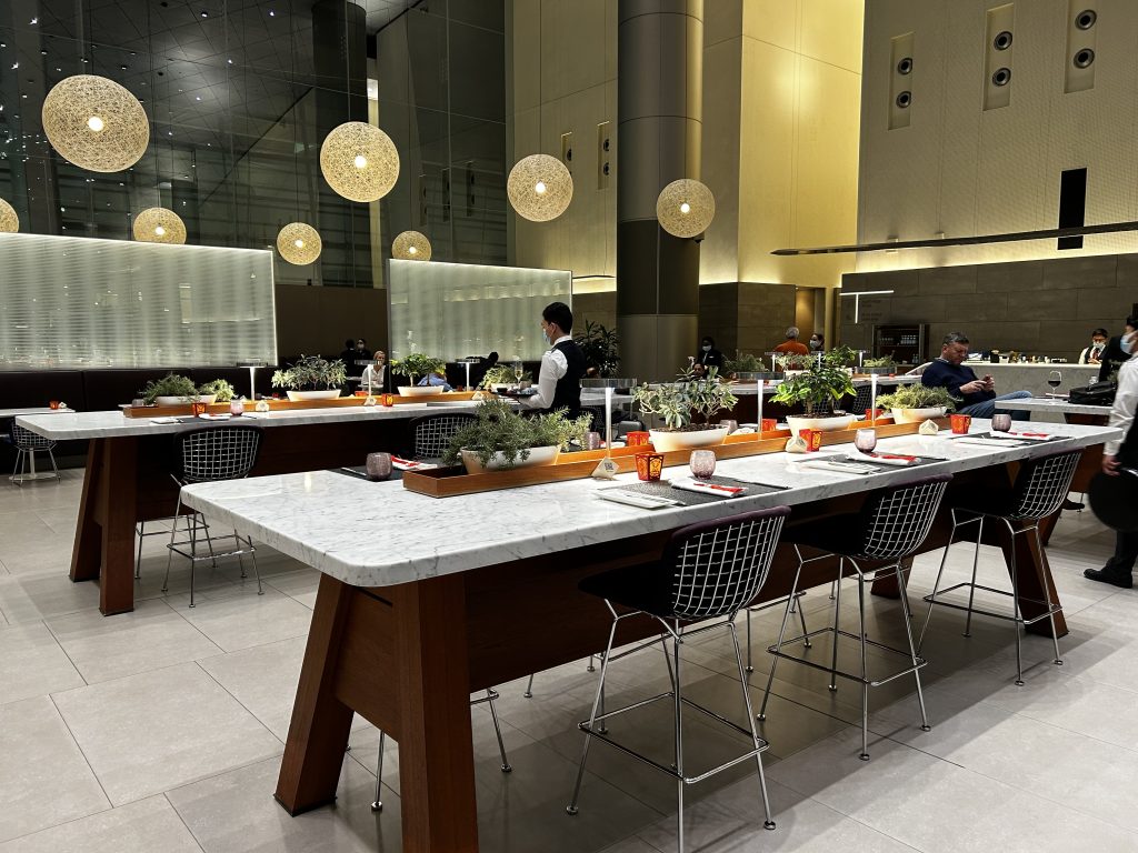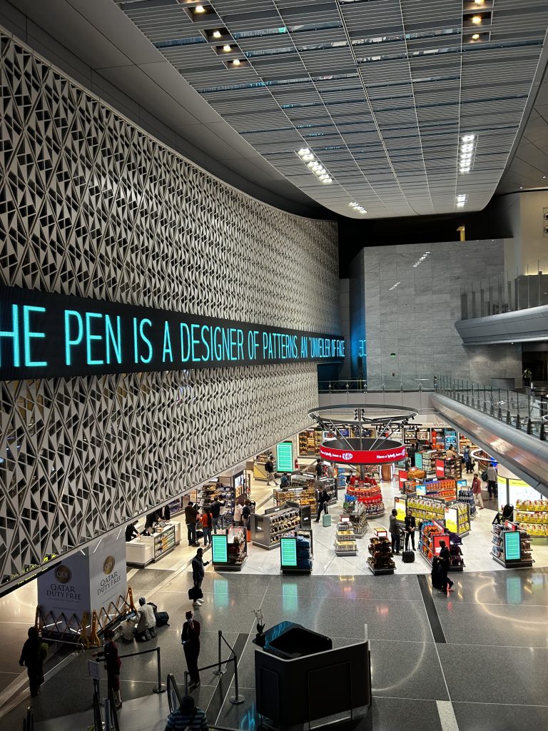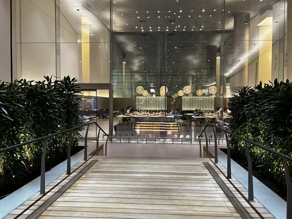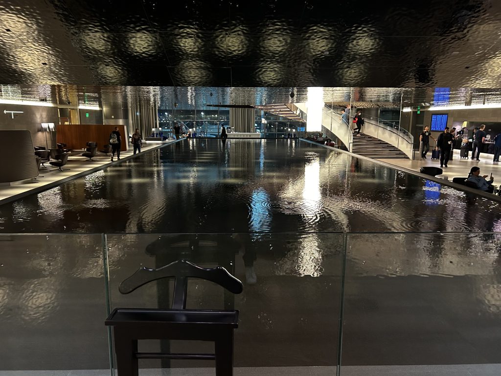 Wer am Doha International ankommt und über ein Business Class Ticket oder einen Status im Verband der Oneworld Airlines verfügt, genießt das Privileg vor dem Abflug in dieser prunkvollen Lounge die Zeit zu verbringen. Selbst mit einem Economy Class Ticket ist hier gegen Bares der Zugang möglich, mein letzter Wissenstand hierzu sind 110 Euro. Mich verschlägt es beim Umsteigen aus Frankfurt kommend für 1.5 Stunden hierher, je nach Tageszeit kann es trotz aller Großzügigkeit recht voll werden. Wer sich nach einer Dusche sehnt, der sollte die Wartezeit entsprechend im Blick haben, denn diese kann mit bis zu 30 Minuten relativ lang werden. Die Lage dieser elitären Fläche befindet sich jenseits der Sicherheits- und Passkontrolle, mitten und oberhalb des Duty Free Paradieses. Über eine breite Rolltreppe gelangt der Gast in den Empfangsbereich, wo alle Zugangsberechtigungen geprüft werden. Ähnlich wie in der Safwa First Lounge fällt auf, dass architektonisch geklotzt und nicht gekleckert wurde. Egal ob viel Granit, edle Materialien und Wasserspiele, hier war definitiv beim Budget und im Bau einiges an finanzieller Luft vorhanden. Neben einem A la Carte- und Buffet Restaurant, gibt es eine Bar, Schlafräume und besagte Duschen, die für eine Erfrischung immer gut sind. Zudem wurde bei der Auswahl der Materialien immer der Ansatz verfolgt die arabische Kultur zu integrieren. Bronzefarbene steile, emporragende Wände, traditionelle Kalligraphie, welche den Weg weisen und die Elemente der Natur, schaffen einen Rückzugsort für den gestressten Reisenden nach oder vor einem Langstreckenflug. Für diese Entspannung sind die Sitzgelegenheiten vielfältig, vom klassischen Business Center, über Liegeräume bis hin zum chilligen Sofa ist alles dabei. Im Restaurant wird lokales, arabisches aber auch mediterranes Essen serviert. So vergeht die Zeit wie im Flug und da keine Ausrufe getätigt werden, sollte man immer seine Boardingtime im Blick haben.