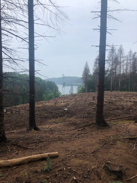 Für die Wanderung im Naturschutzgebiet nehmen wir uns den nordöstlichen Teil der Sperre vor. Ausgangspunkt an einem verregneten Pfingstsonntag ist der Parkplatz am Hutsherweg, in der Nähe des Örtchens Weiden. Oberhalb vom See im dichten Wald lässt es sich geschützt Wandern, es wechseln sich Wald mit hellen Lichtungen ab und die eine oder andere Aussicht auf die Vorsperre Große Dhünn, macht die Kilometer doch sehr abwechslungsreich. In der Spitzkehre angekommen, verläuft der Weg direkt entlang am See. Er ist gesäumt von gefällten Bäumen, bei denen klar wird, dass die Forstwirtschaft eine gewisse wirtschaftliche Rolle spielt! Holz als nachwachsende Rohstoff-Quelle ist heute immer noch in der nachhaltigen Bauwirtschaft sehr gefragt.  Aber auch die violetten Glockenblumen sind einen Blick wert und fügen sich wunderschön in das Landschaftsbild ein. Als das Wetter stabiler wird und ein wenig die Sonne rauskommt, genießen wir den kulinarischen Teil der Wanderung. Ein Roggenbrötchen mit Bergkäse, Avocado und dem passenden Avocadogewürz dazu. Der hausgemachte Kartoffelsalat mit frischen Kräutern und einem Stück gebratenen Iberico-Schweinerücken mundet ebenfalls. Der Blick von der Bank auf den See mit dem schmackhaften Essen zu verbinden ist schlussendlich „PRICELESS“.