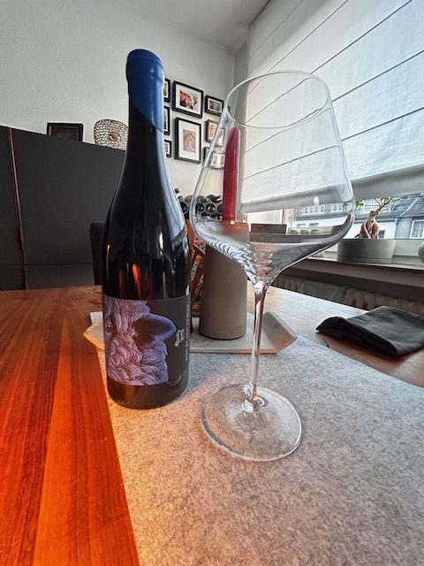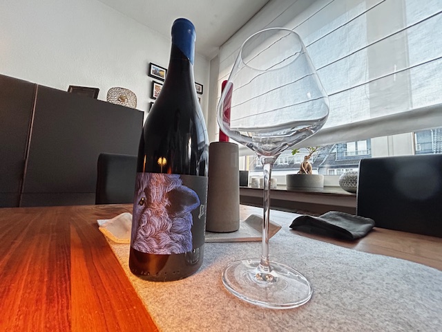 Ist ein klassischer Burgunder und sollte entsprechend auch aus einem solchen Glas getrunken werden. Mit 18.90 Euro verlässt er auch definitiv den Bereich eines Preiseinstiegsproduktes, allerdings wird meines Wissens auch ein Teil der Verkaufspreises gespendet. Der relativ helle Wein glänzt schön im Glas, in der Nase finden sich erdige Aromen und Beerennoten. Er passt hervorragend zu rare gebratenen Thunfisch, einem Stück Rind oder einem Wild-Schmorgericht. Ideal für die nun anstehende Jahreszeit mit ihren kühlen bis kalten Temperaturen. Mit 14% Alkohol ist er sicherlich ein voluminöser Wein und ist gut dosiert am besten zu genießen.