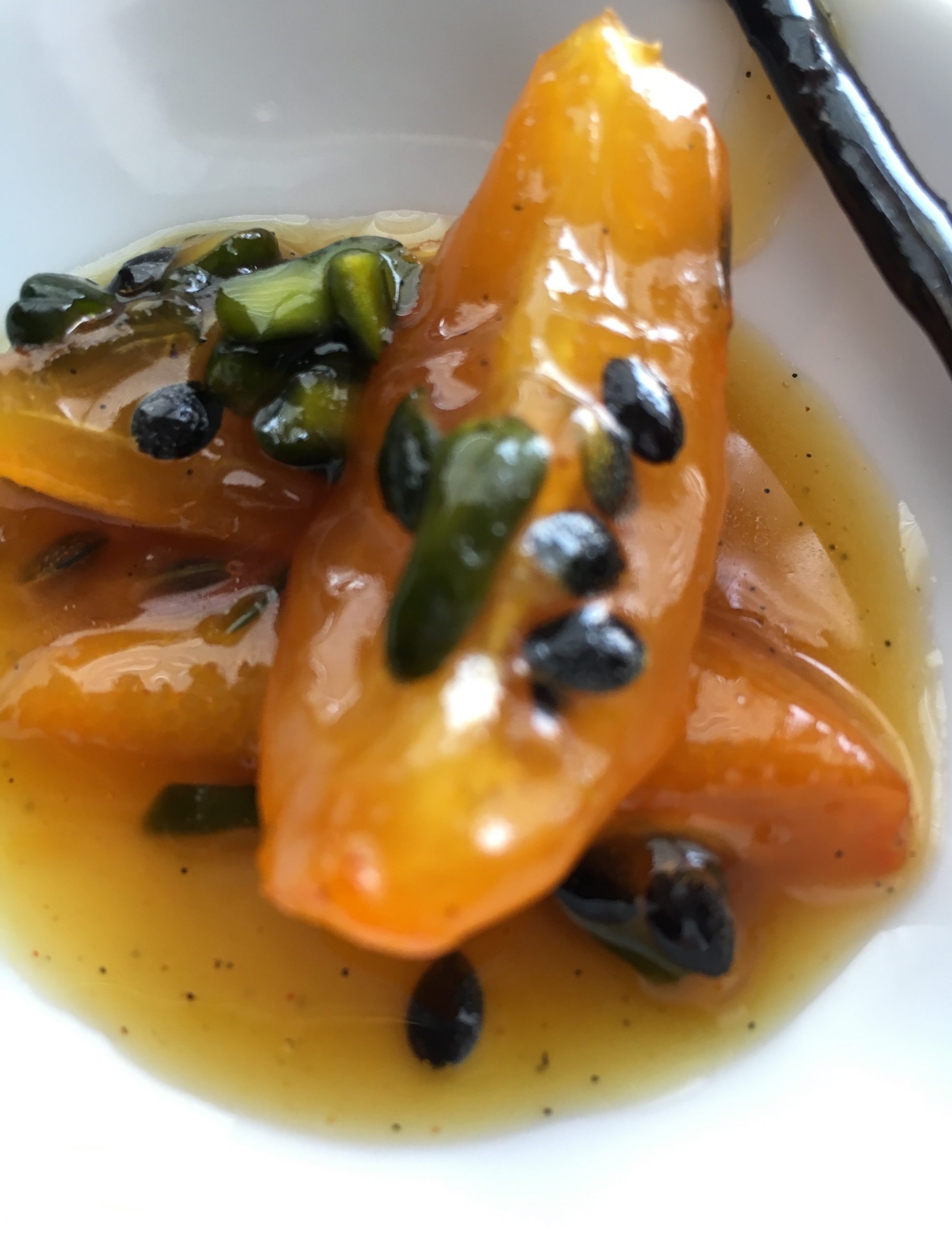 Zucker in einer Pfanne karamellisieren lassen. Mit Orangensaft auffüllen, die aufgeschnittene Vanilleschote hinzugeben, aufkochen lassen damit es keine Karamellklümpchen mehr gibt. Die gewaschenen, geviertelten Kumquats (Zwergorangen) bereitstellen und erst in die Flüssigkeit geben, wenn diese leicht zähflüssig ist. Dann 1-2 Minuten bei reduzierter Temperatur köcheln lassen, etwas Apfelessig, Olivenöl und eine Prise Salz final abschmecken. Mit halbierte Pistazienkernen fertigstellen.